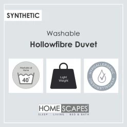 Do not be fooled by the lightness of this duvet, thanks to the incredibly fine and light Hollowfibre material, a thinner synthetic duvet can maintain the same amount of warmth as a thicker duvet with a natural filling. If you do not like the feeling of a weighty duvet, then a Hollowfibre option may be perfect for you. Available in single, double, king size and super king size, our hollowfibre duvets are perfect for those who like to wash their duvets regularly.