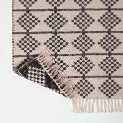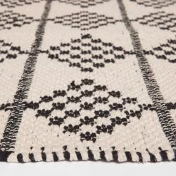 Adana patterned woven rug in black and natural. Available in two sizes, this monochrome rug has been handwoven from luxury 100% cotton and features macrame tassels.