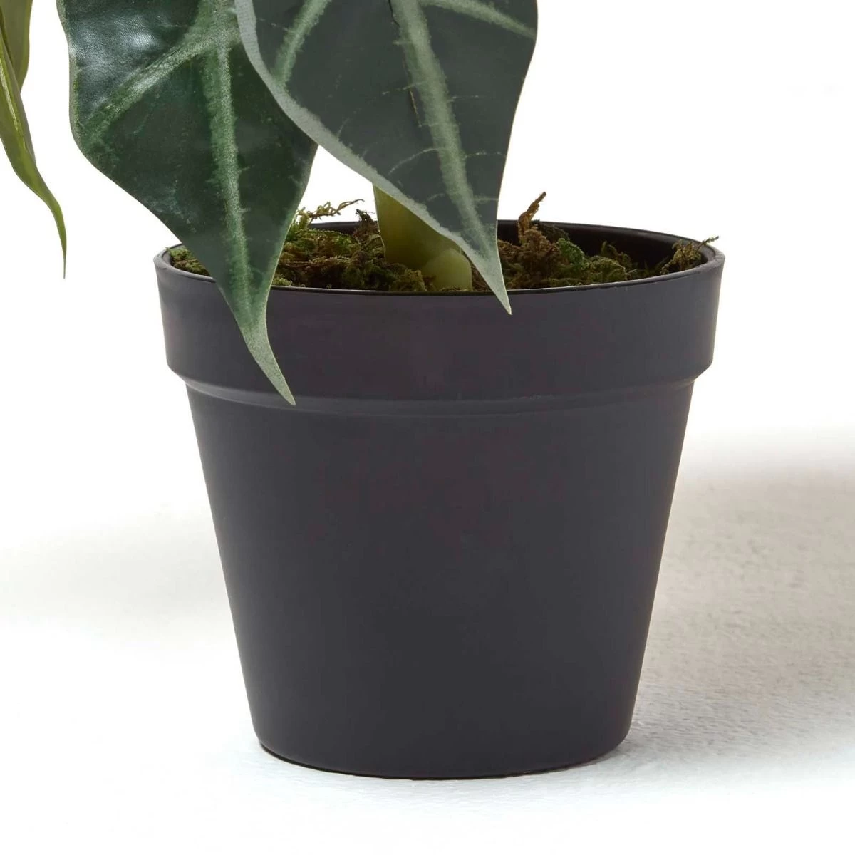 Artificial alocasia polly plant in pot, this fake decorative indoor plan features and array of pointed variegated leaves sitting on lifelike stems, artificial plant for indoor decoration.