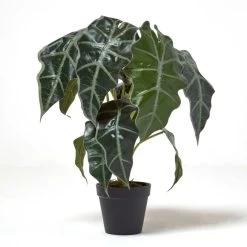 A lifelike alocasia plant measuring 50 cm tall, also known as the Amazonian elephant ear plant this striking plant features an array of large and long leaves with a variegated effect. Just like the real thing, it is a full plant that will be a welcoming addition to any home, remaining vibrant all year through. Style among other artificial and real plants to create the perfect look.