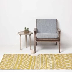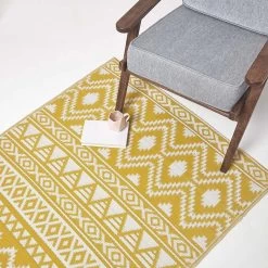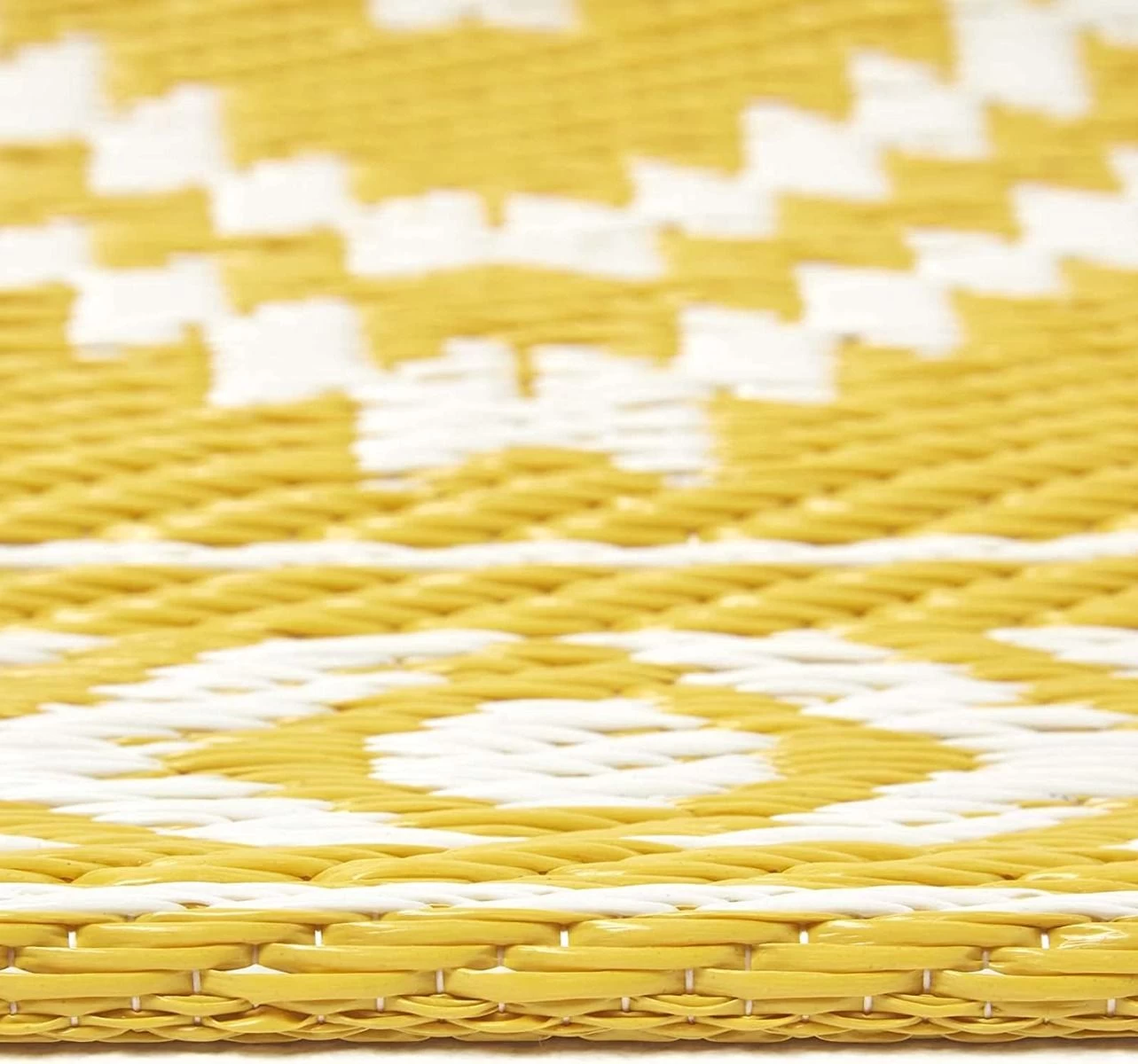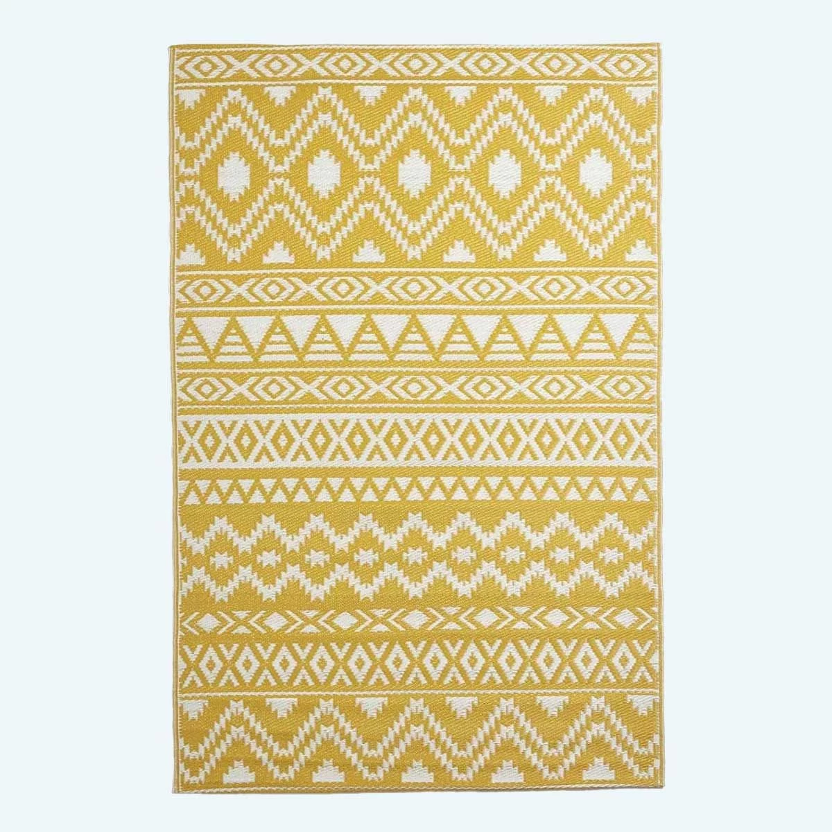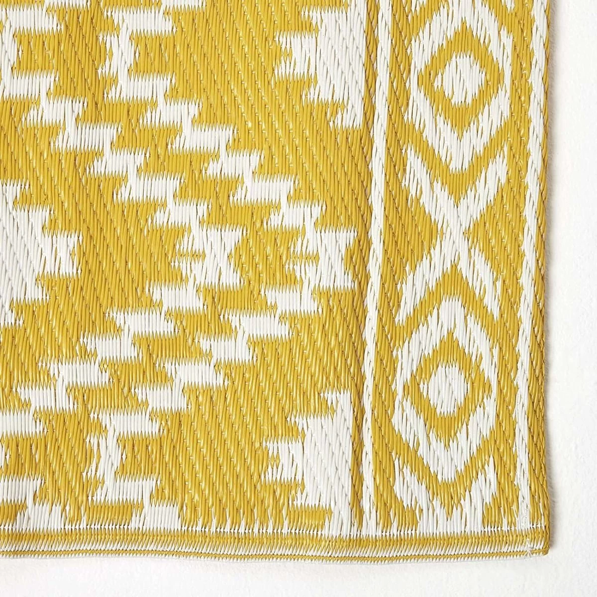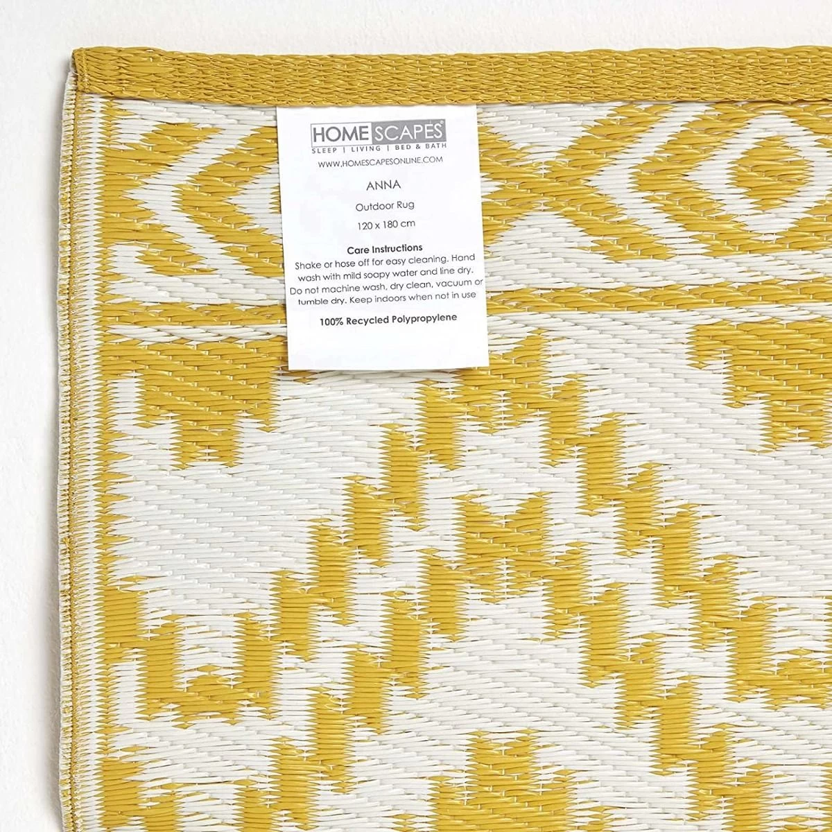 A yellow and white Aztec styled rug woven from 100% recycled plastic. The Anna garden rug will compliment most outdoor styles with its bright and sunny colours, making it the perfect choice for the summer. All of the Homescapes patio rugs are lightweight and durable, as well as water resistant, making them perfect for styling outside. Simply wipe down the mat as needed with warm soapy water.