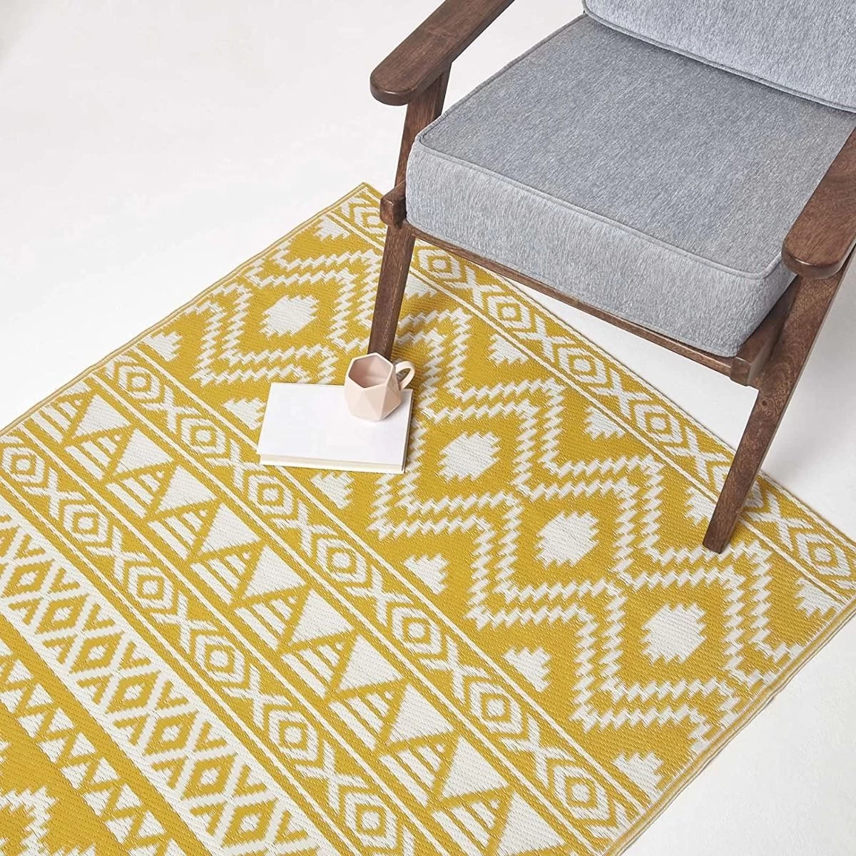 The Homescapes Aztec white and yellow outdoor rug is woven from 100% recycled plastic, while being both light weight and weather resistant, as well as durable.