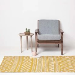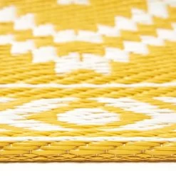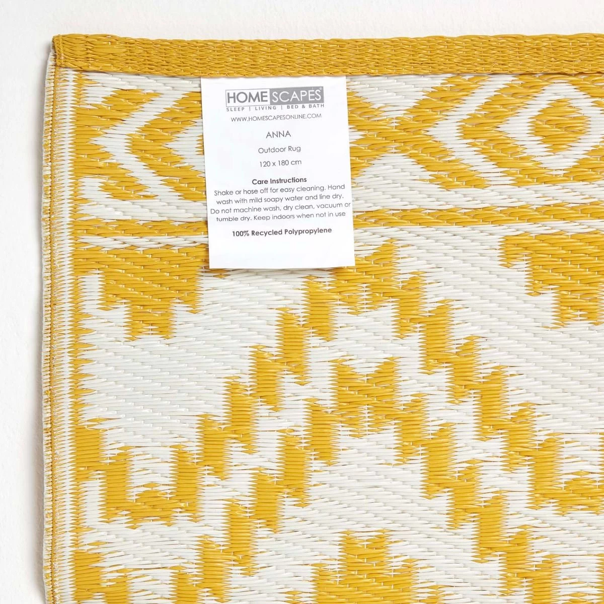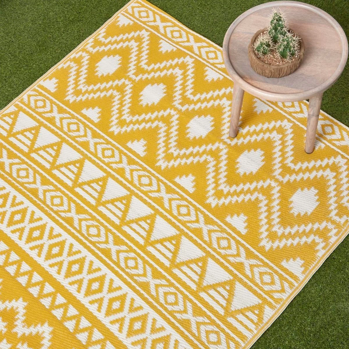 A yellow and white Aztec styled rug woven from 100% recycled plastic. The Anna garden rug will compliment most outdoor styles with its bright and sunny colours, making it the perfect choice for the summer. All of the Homescapes patio rugs are lightweight and durable, as well as water resistant, making them perfect for styling outside. Simply wipe down the mat as needed with warm soapy water.