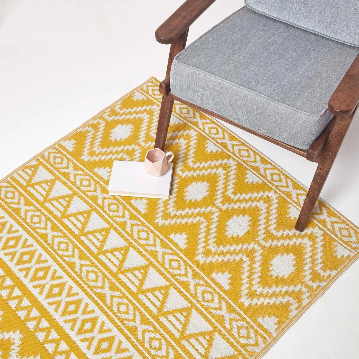 The Homescapes Aztec white and yellow outdoor rug is woven from 100% recycled plastic, while being both light weight and weather resistant, as well as durable.
