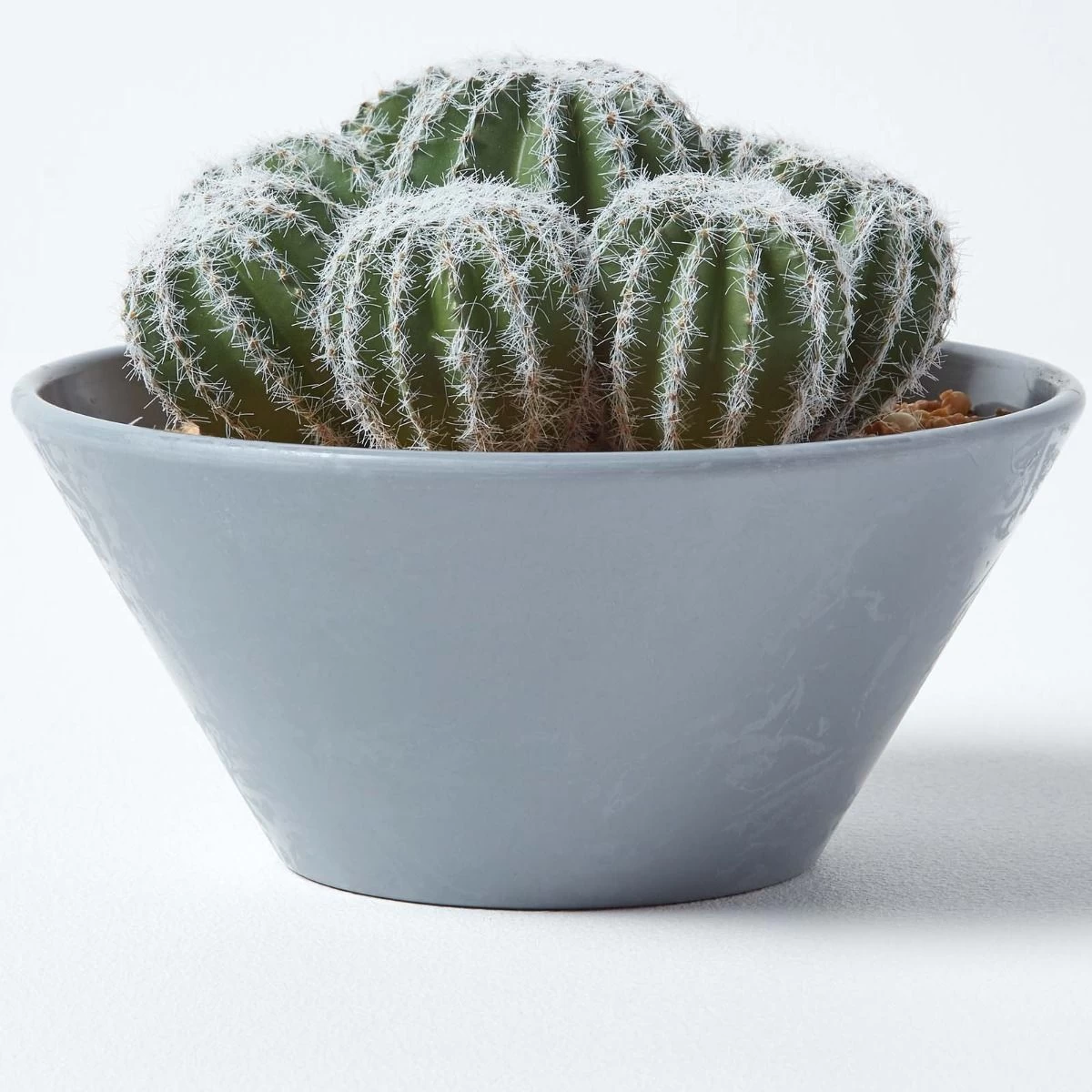 Create a botanical look in your home with this artificial Barrel Cactus arrangement from Homescapes. Set inside a decorative grey melamine pot, it has faux gravel for an authentic finish. Measuring 17 cm in height, it is the ideal size to decorate your bookshelf, side tables or coffee tables.