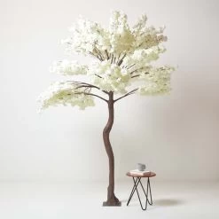 Tall artificial blossom tree in cream, measuring 8’8 foot with a realistic wooden trunk for an authentic look which is set onto a sturdy metal base.