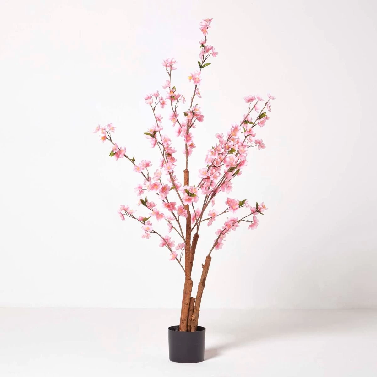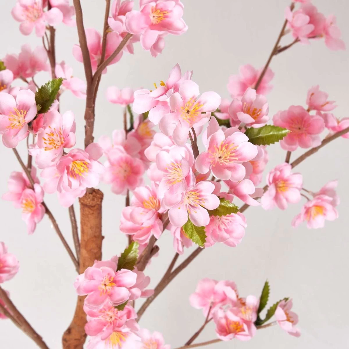 130 cm tall pink cherry blossom tree, with realistic wood effect stem, ideal for indoor decoration around the home, for weddings and events, sits in a sturdy plastic pot.