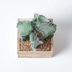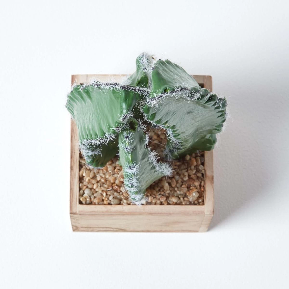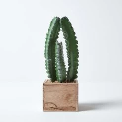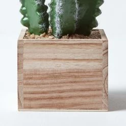 Stylish faux cactus from Homescapes measuring approximately 33 cm in height and set inside a decorative wooden planter.