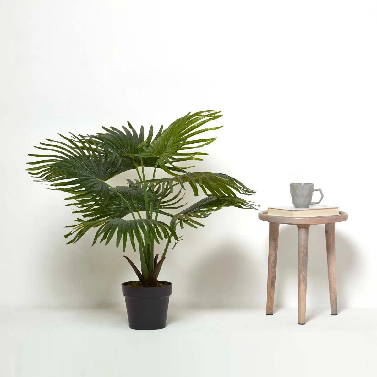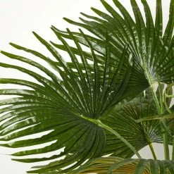 A vibrant artificial palm tree measuring 80 cm tall, this fan palm features an array of large fanned out leaves and sits with a black plastic pot. Just like the real thing, it is a full plant with a generous quantity of leaves that will be a welcoming addition to any home, remaining vibrant all year through. Style among other artificial and real plants to create the perfect look.