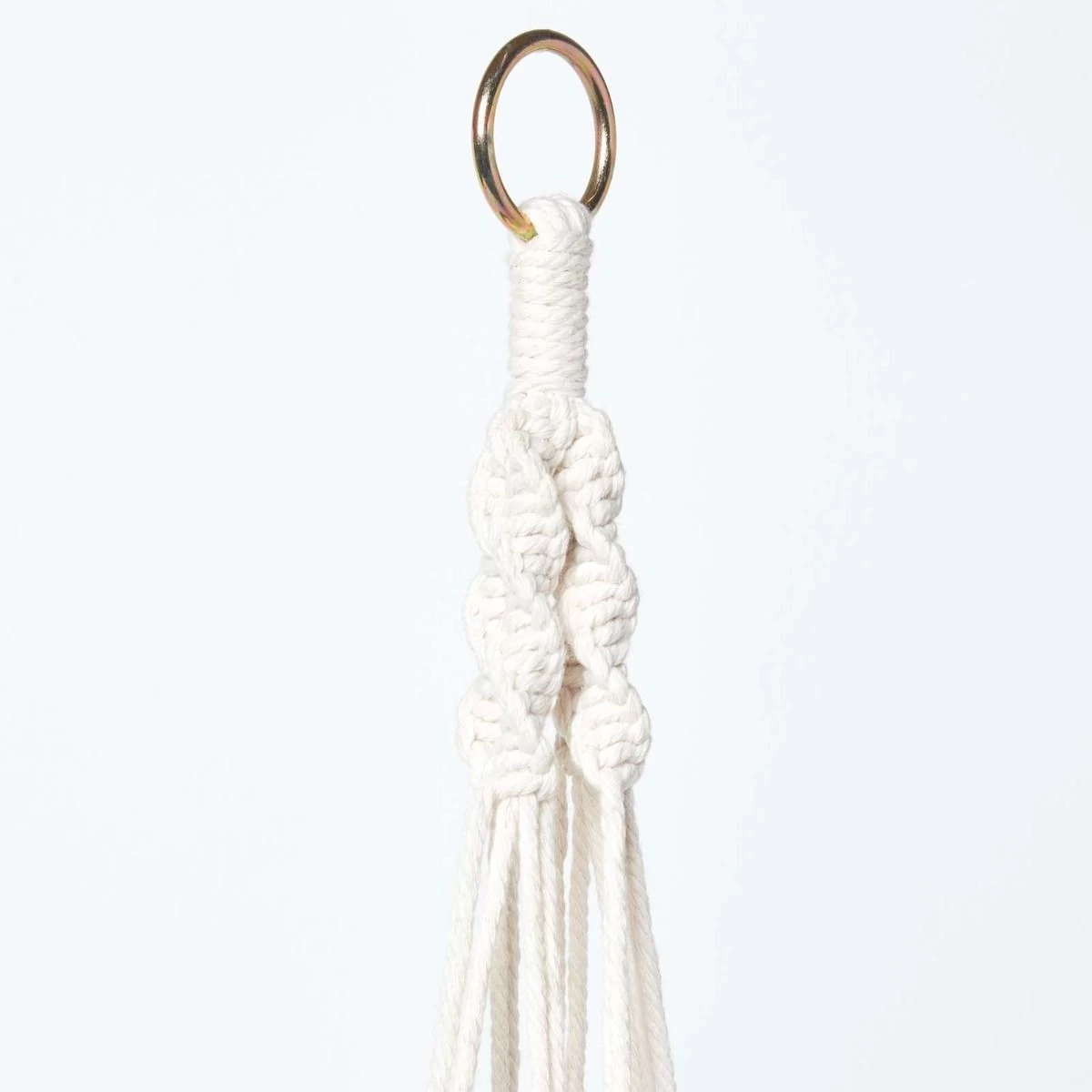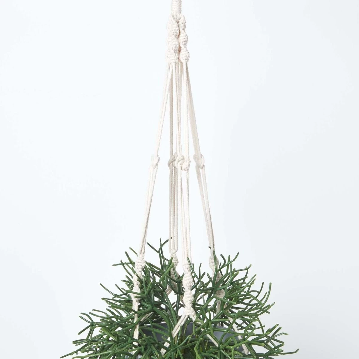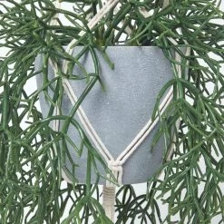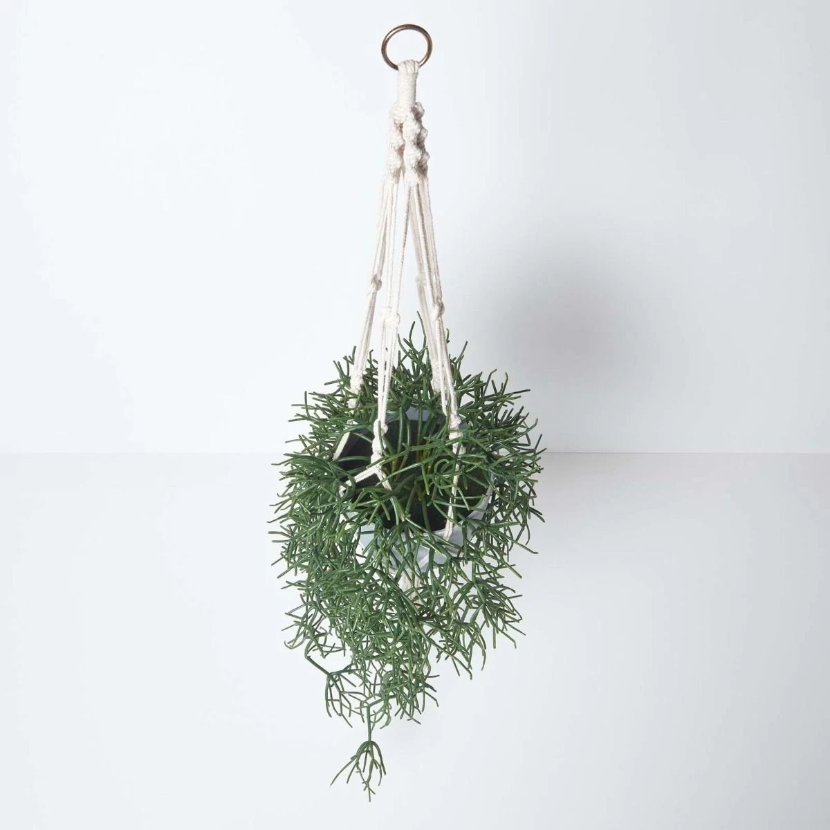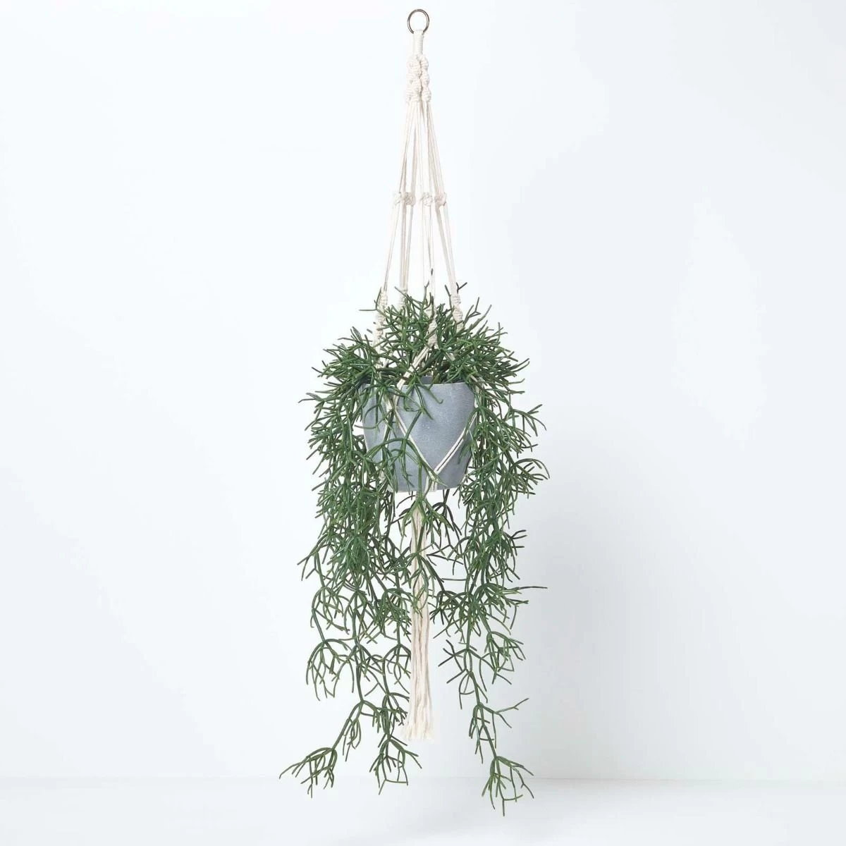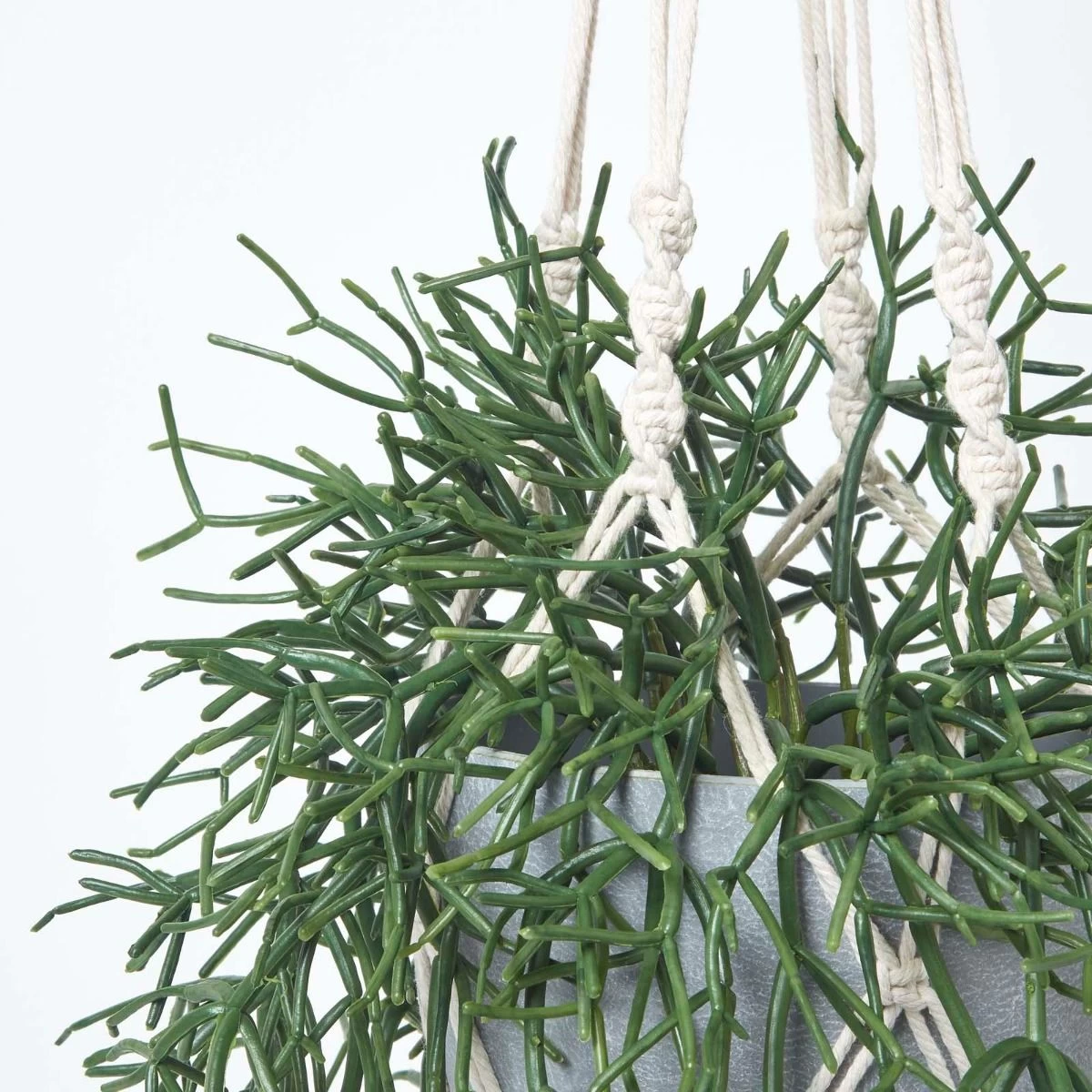 Artificial hanging basket with faux Rhipsalis mistletoe cacti plant in a decorative melamine pot and macramé style hanging rope, a lifelike faux hanging plant perfect for adding greenery to the home.