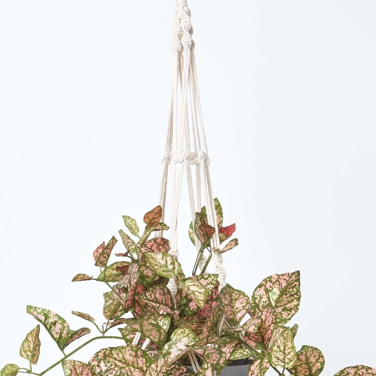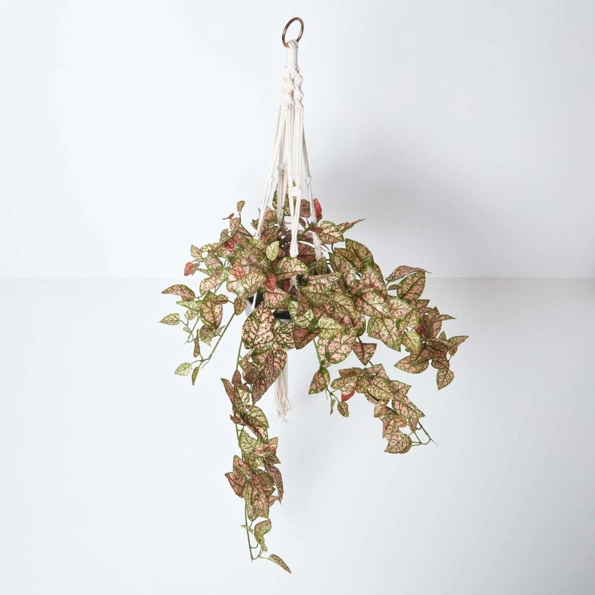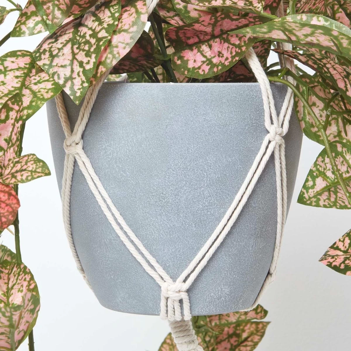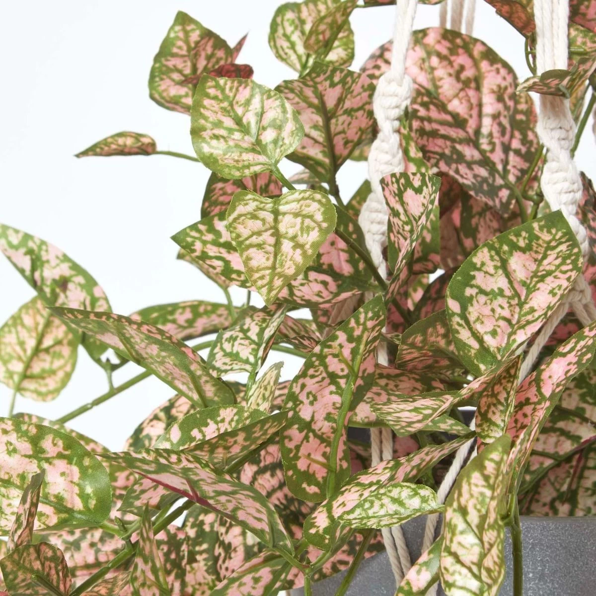 Artificial ivy polka dot plant artificial hanging basket in a decorative grey pot and macramé hanging basket with long pink and green leaves perfect to refresh your interior.