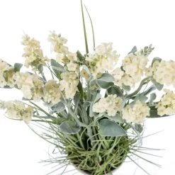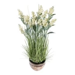 Unique artificial plant from Homescapes featuring white lavender amongst grassy foliage. Measuring approximately 66 cm tall, set inside a metallic pot.