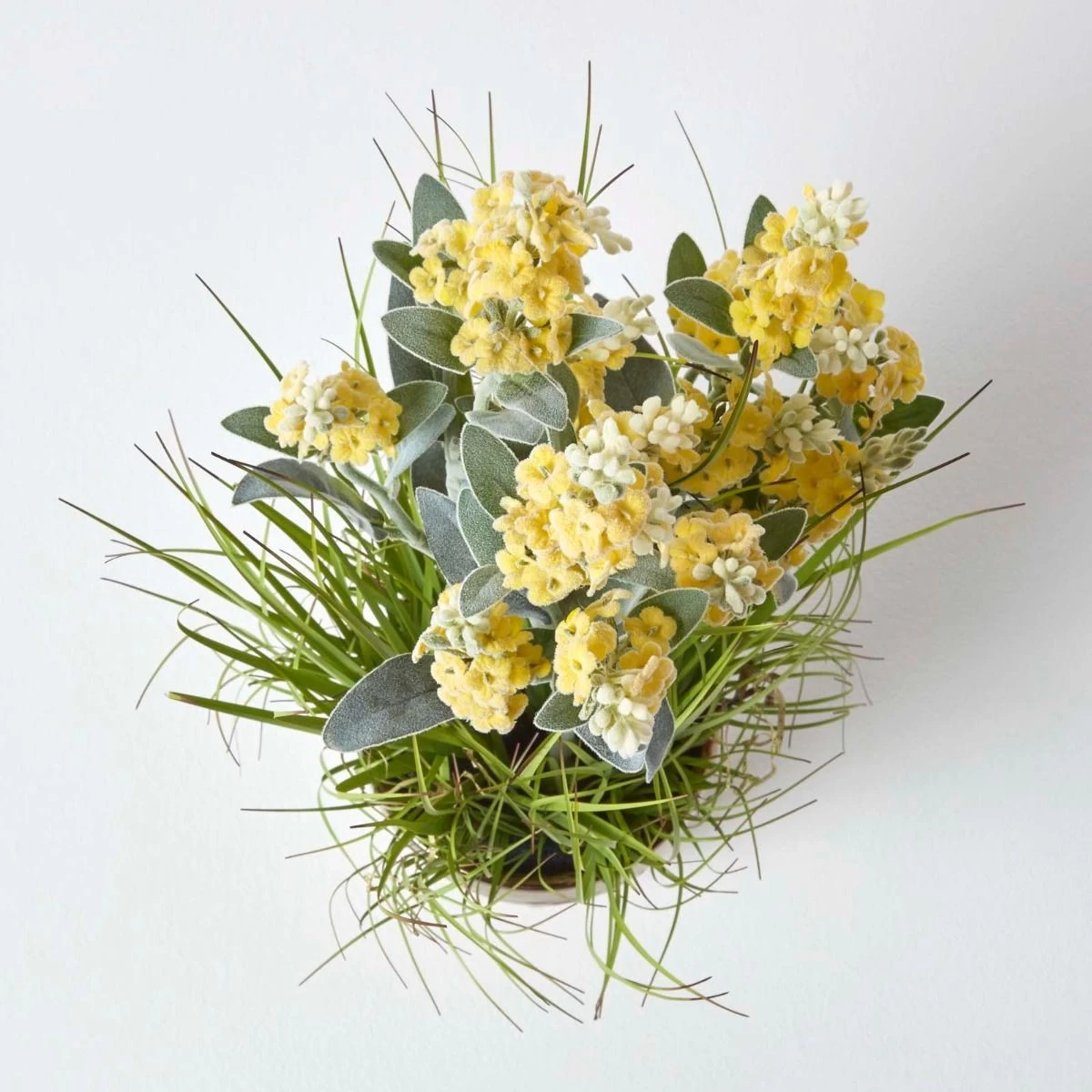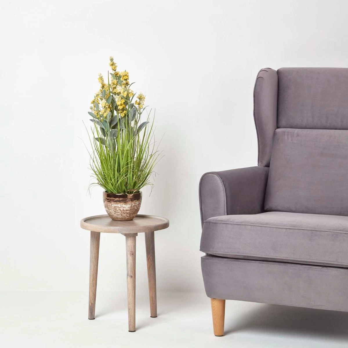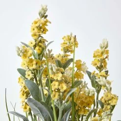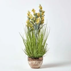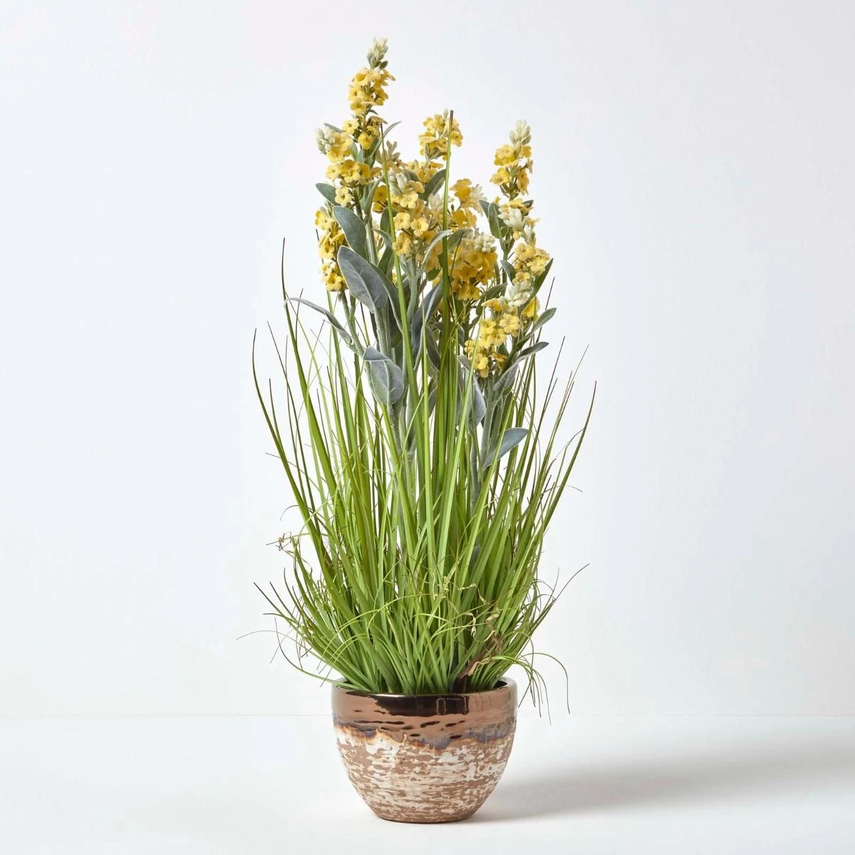 Brighten up any room with Homescapes’ faux yellow lavender plant. Featuring bright yellow lavender amongst leafy green foliage, you can create a natural look in your home without the fuss of maintaining real plants. This tall lavender plant comes inside a ceramic white and bronze metallic pot, adding style to your interiors.