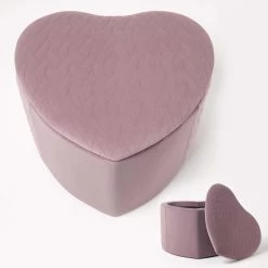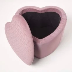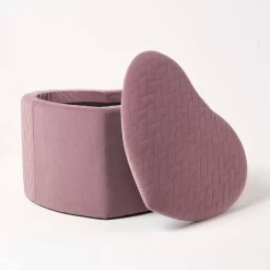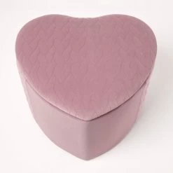 Arundel heart-shaped pink velvet footstool with a quilted stitch design for additional comfort featuring a detachable lid and hidden storage compartment inside.