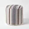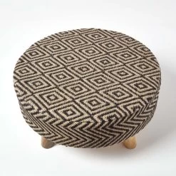Circular, flat stool with geometric style black and off-white diamond pattern, handmade from cotton fabric with a cushioned seat and supported by a strong wooden frame to ensure long lasting rigidity and shape. This footstool is an ideal addition to both fabric and leather sofas and is the perfect, functional accessory in any living space.