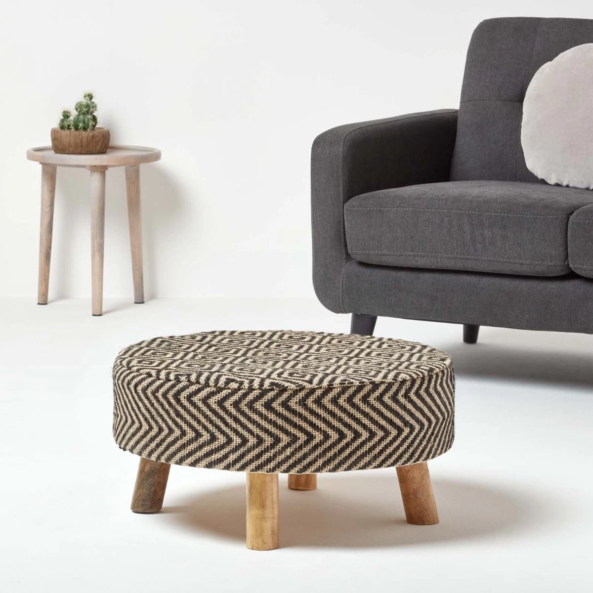 Black and natural diamond patterned fabric round footstool with wooden legs, measuring 62cm wide, this modern design will look great in modern style living rooms.