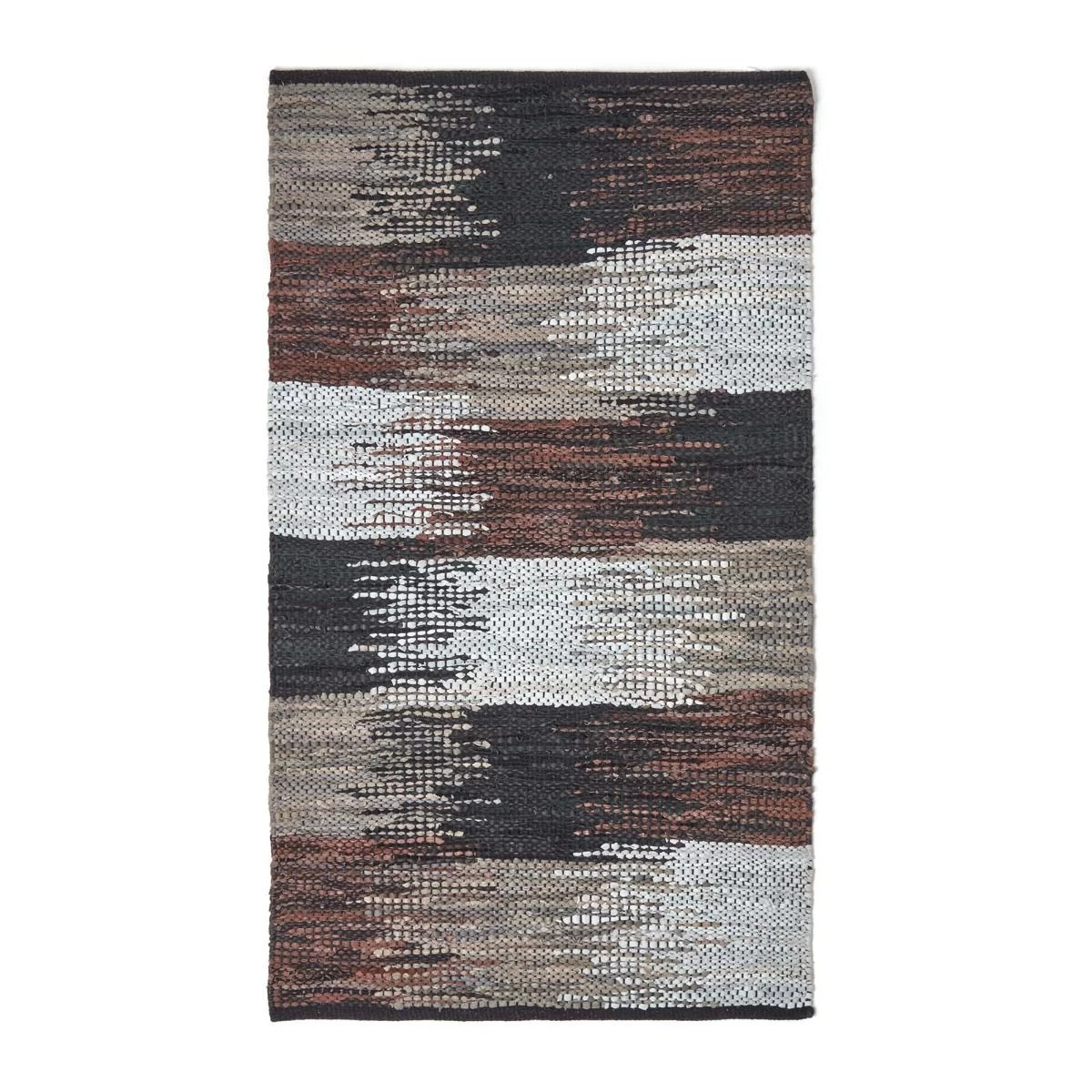 Multi-coloured black, cream and brown cut shuttle style rug, handcrafted from recycled leather, this hardwearing floor rug is available in various sizes.