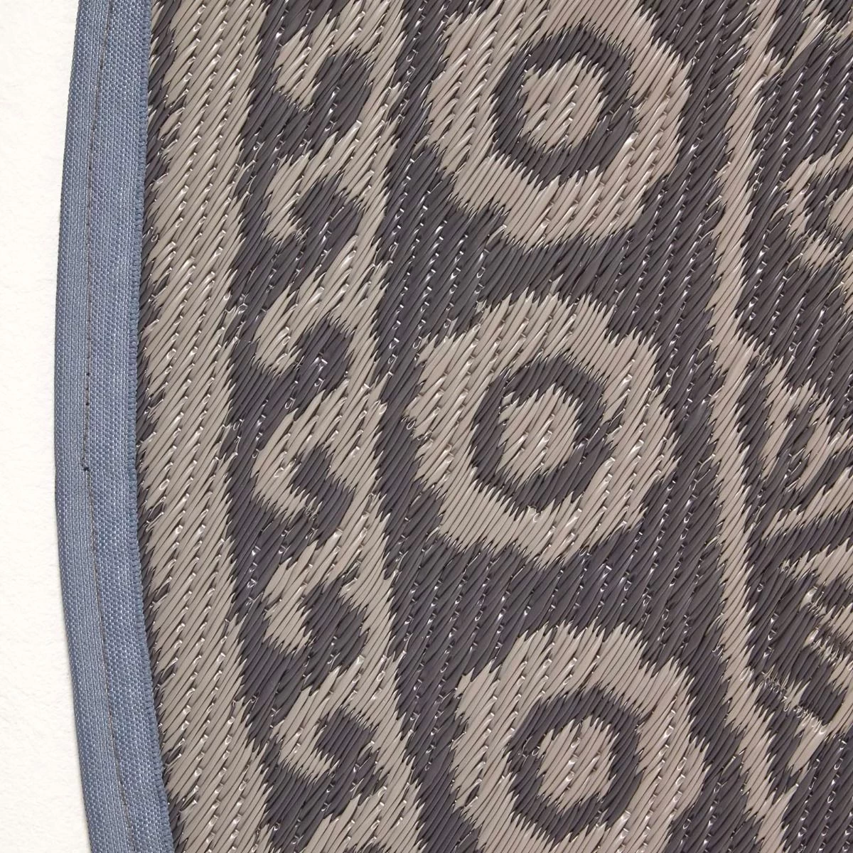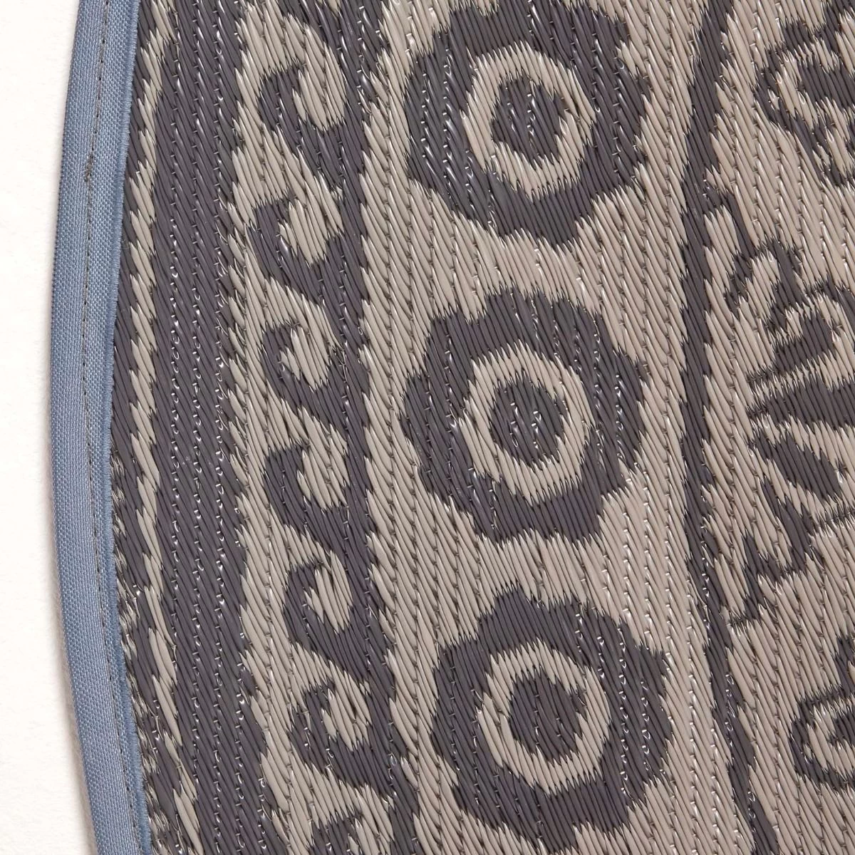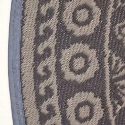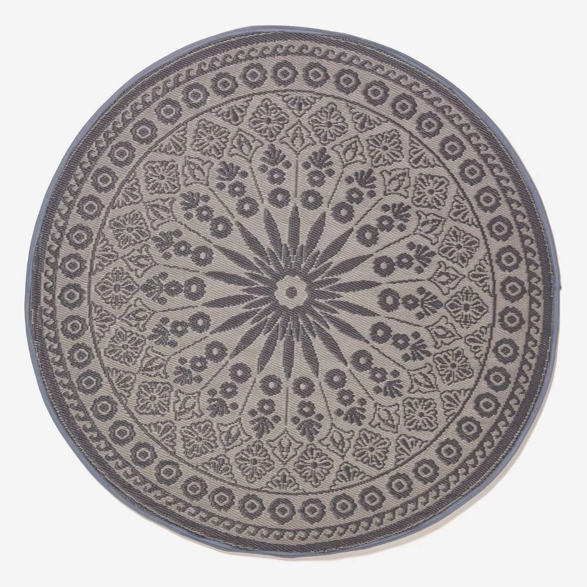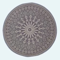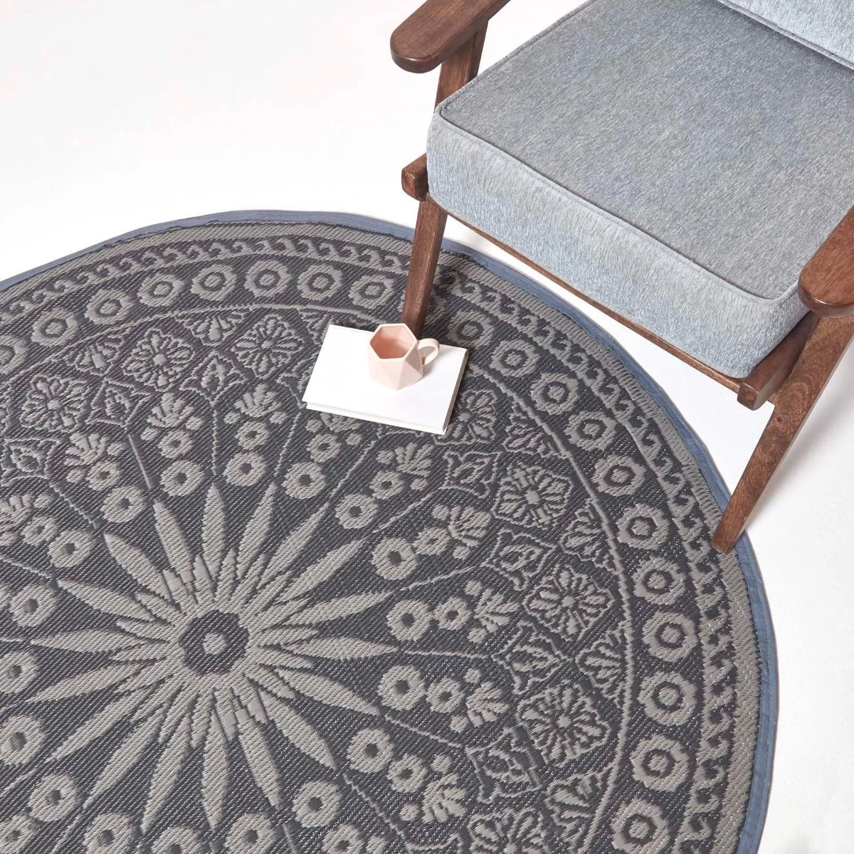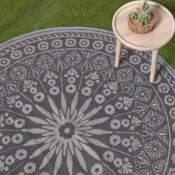 Reversible round outdoor rug with a mandala pattern. Each 170cm round outdoor rug is woven from recycled plastic and water-permeable, ideal for all gardens and patios.