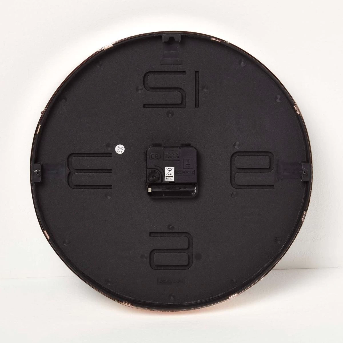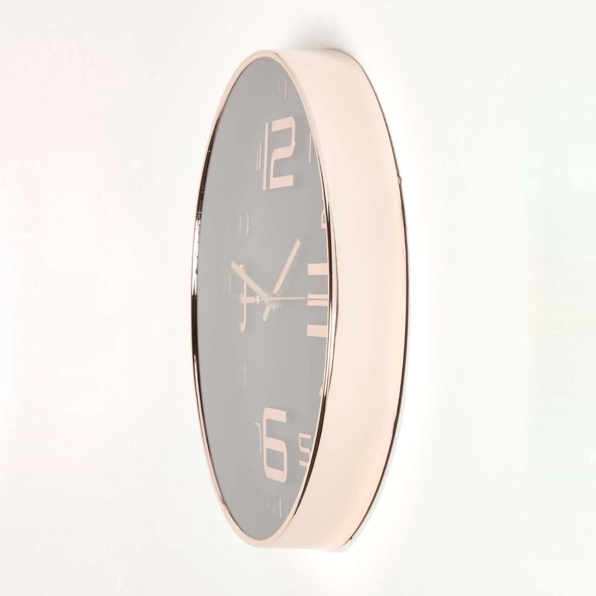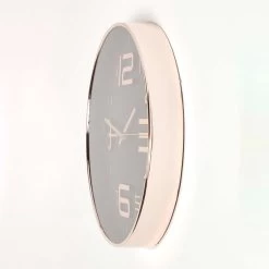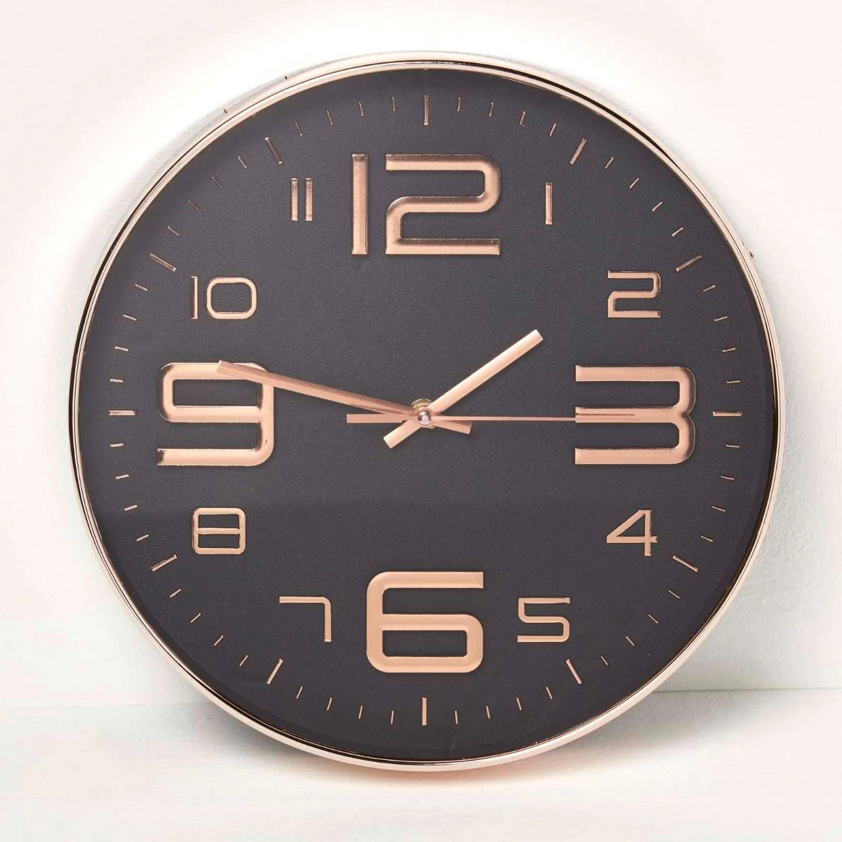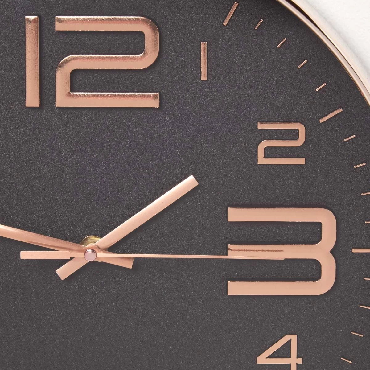 Modern style round wall clock in black and rose gold. Ideal for making a statement in the living room, hallway or bedroom, this copper clock adds a modern look to your home.