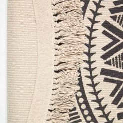 Black and white geometric rug with contemporary style monochrome design. This bohemian style indoor is printed with a black and off white mandala design and features a tasselled edge. Perfect for styling in contemporary and retro style living spaces, pair with textured cushions and throws to create the perfect, chic look.