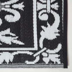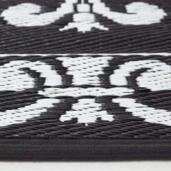 Damask patterned black and white outdoor rug. Reversible outdoor balcony rug, great for using in the garden, patio, on balconies and more. Spot clean only.