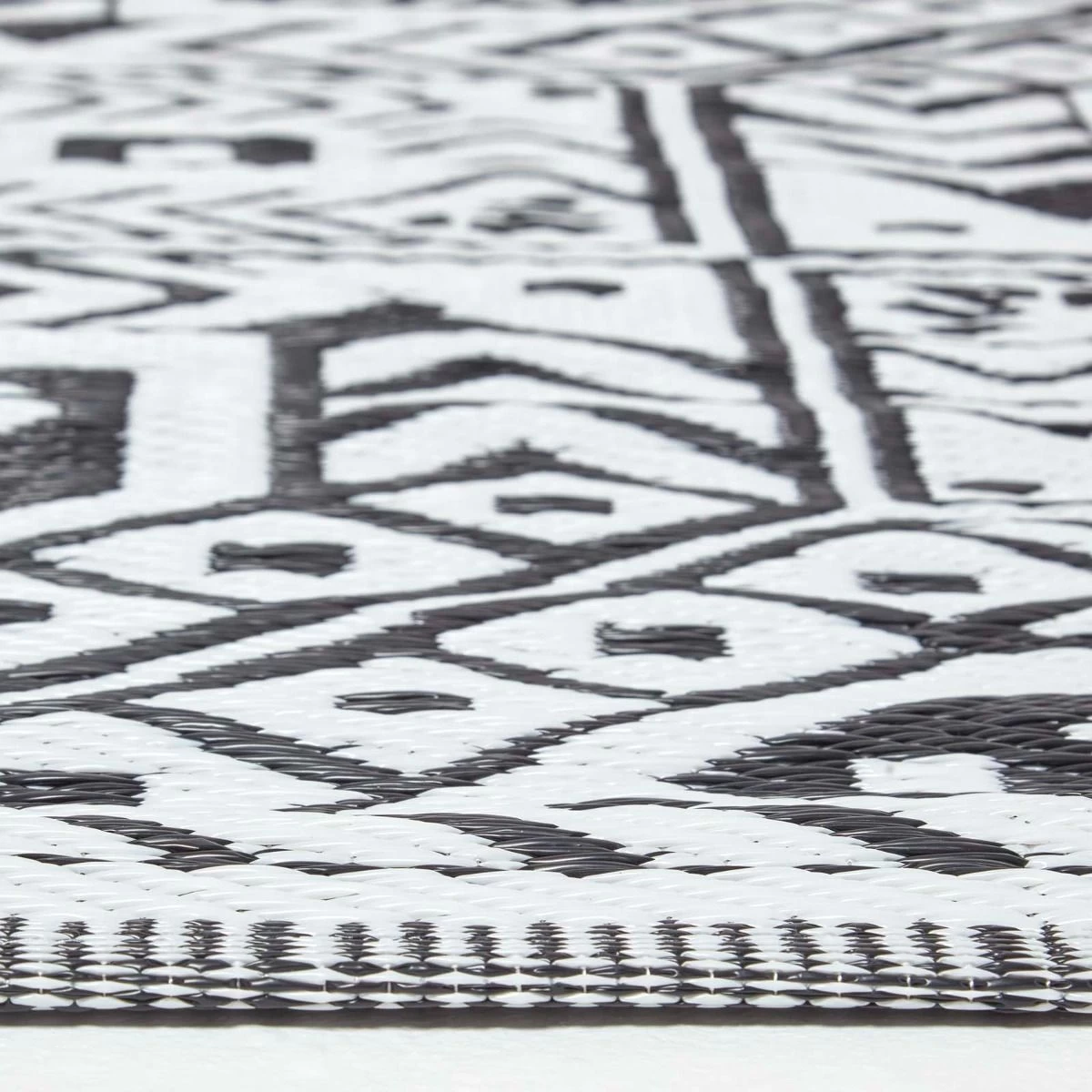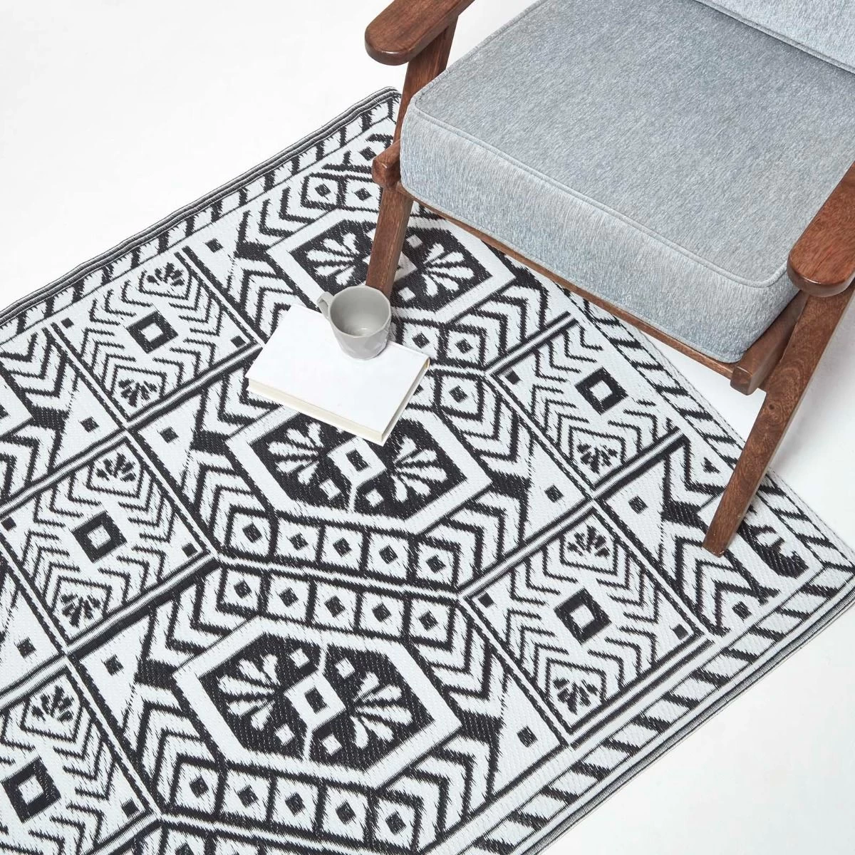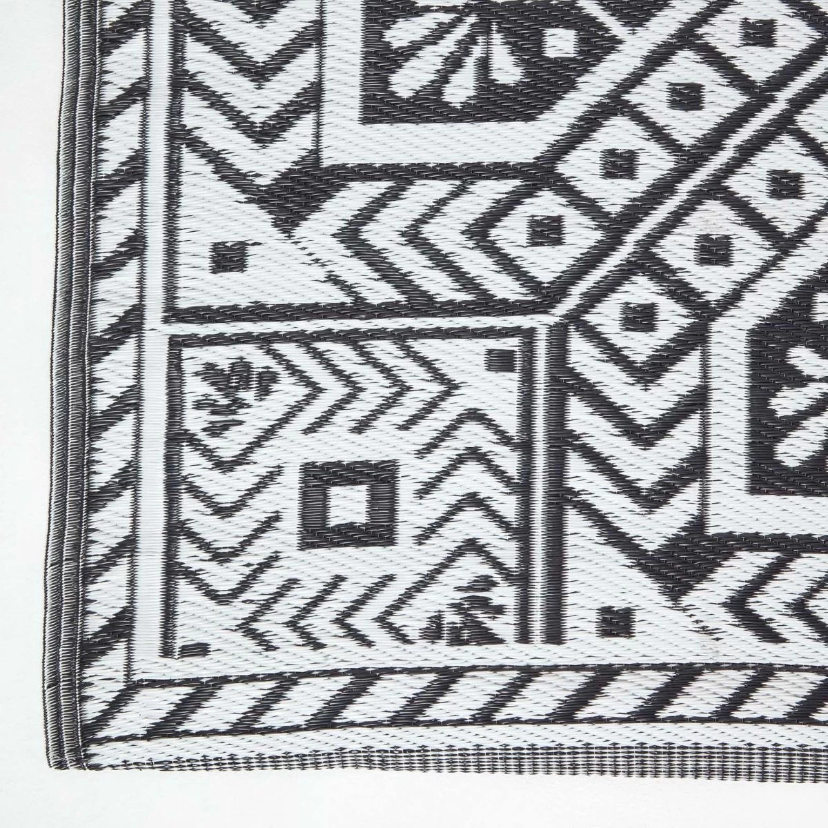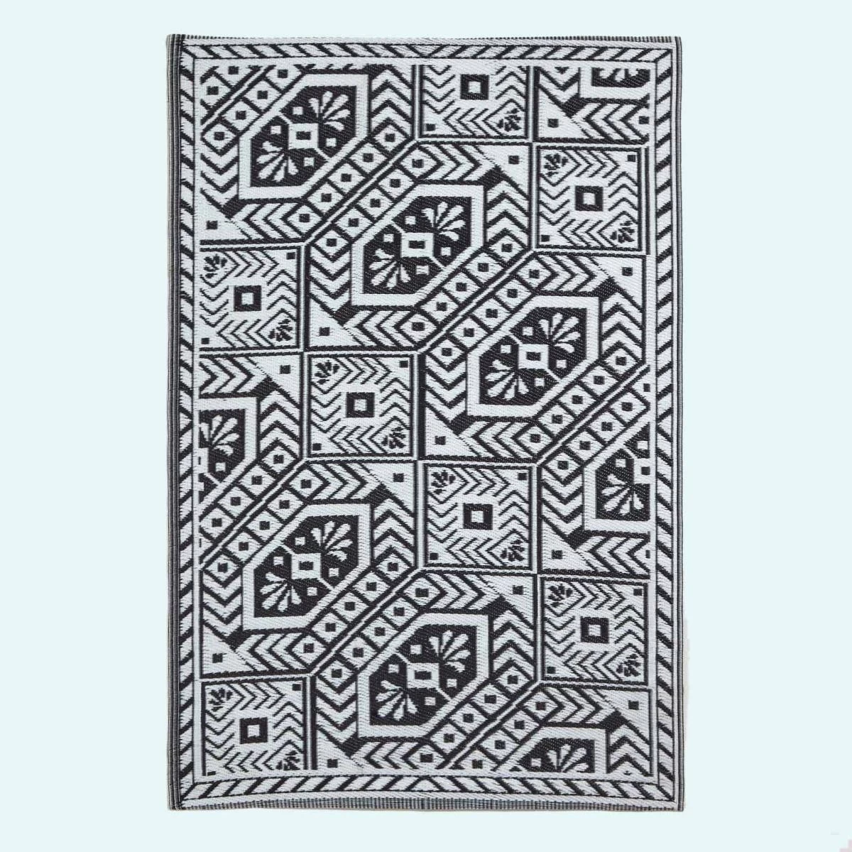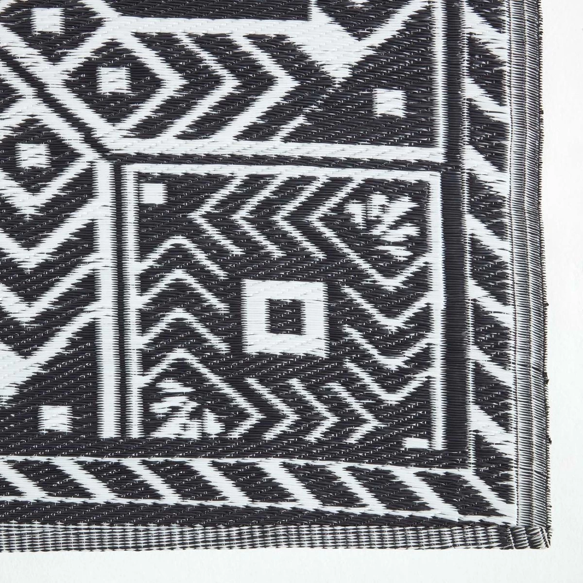 White and black outdoor rug from Homescapes. Geometric style garden rug with aztec pattern; woven from 100% recycled polypropylene, this rug is weather resistant.