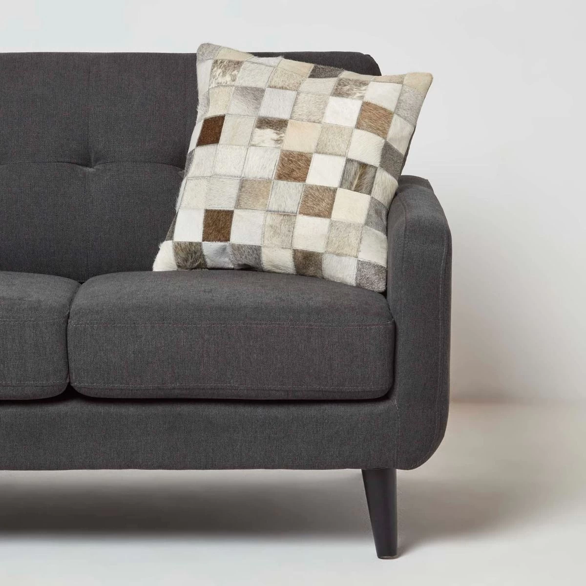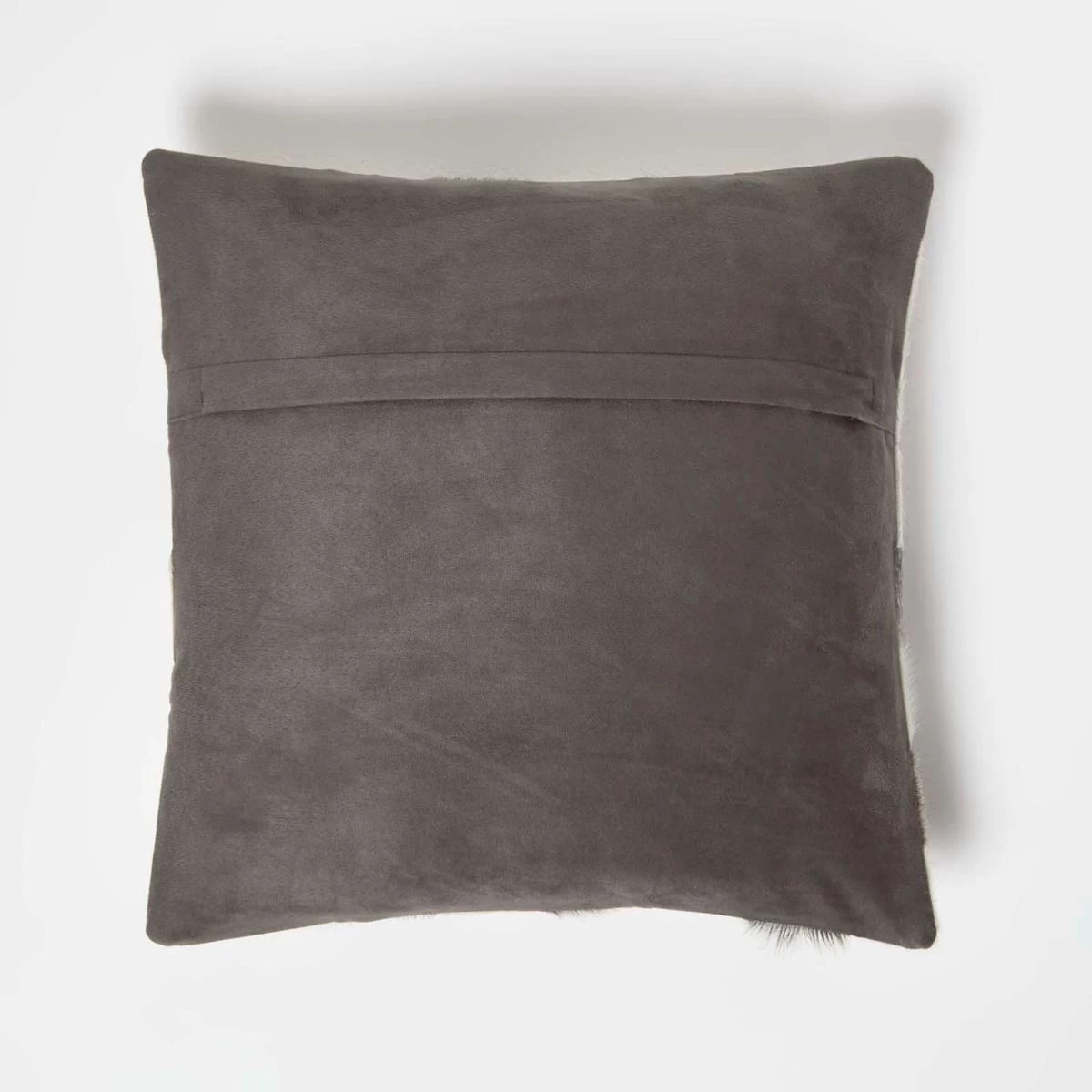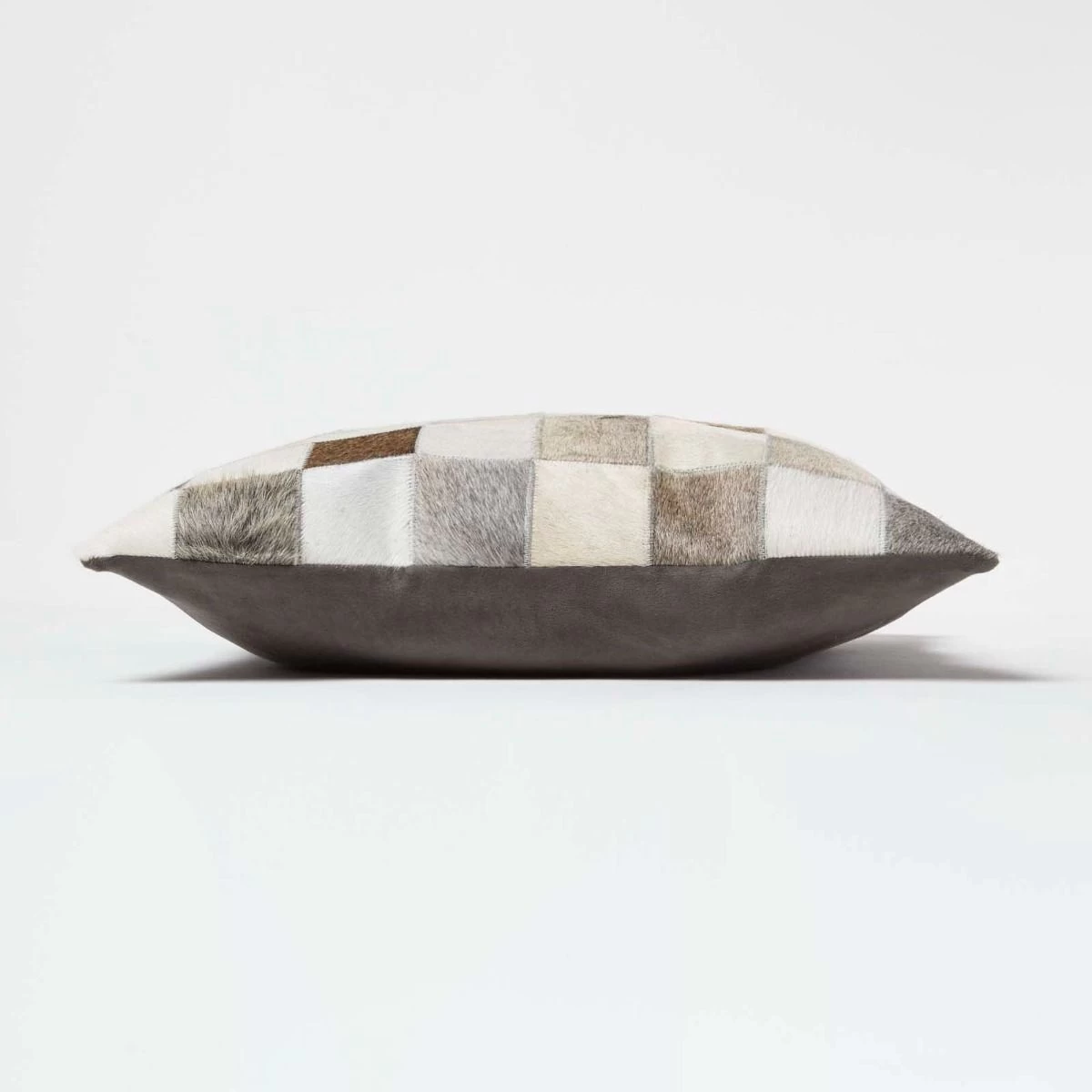 Crafted for both comfort and style, this generously filled sofa cushion has a patchwork leather hide front in shades of grey and cream, with a grey suede reverse cover. This textured cushion features an on-trend check design, making it the ideal statement piece for your living space or bedroom. Due to the natural materials used and handmade nature, each leather cushion will appear slightly different than the image shown.