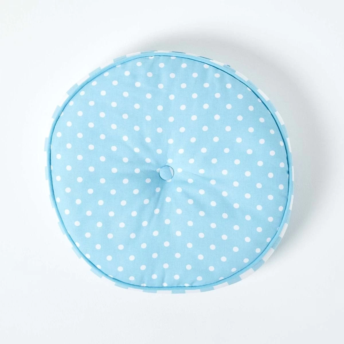 Blue and white polka dot floor cushion, this round cushion can be used on the floor, on garden furniture or by children for playing and napping. Woven from 100% cotton, the spotted cover features a handy carry handle for easy transportation. Prefilled with super microfibre, it will add that extra layer of comfort whilst sitting.