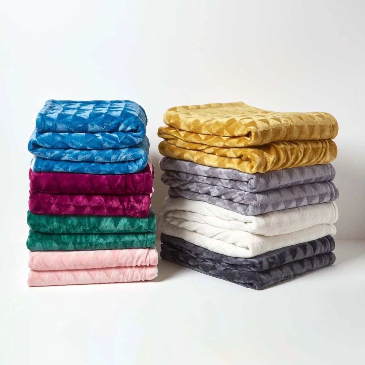 Soft and fluffy blush pink throw for sofas and beds geometric throw with on-trend triangular pattern, this cosy velvet throw is available in 3 large sizes.