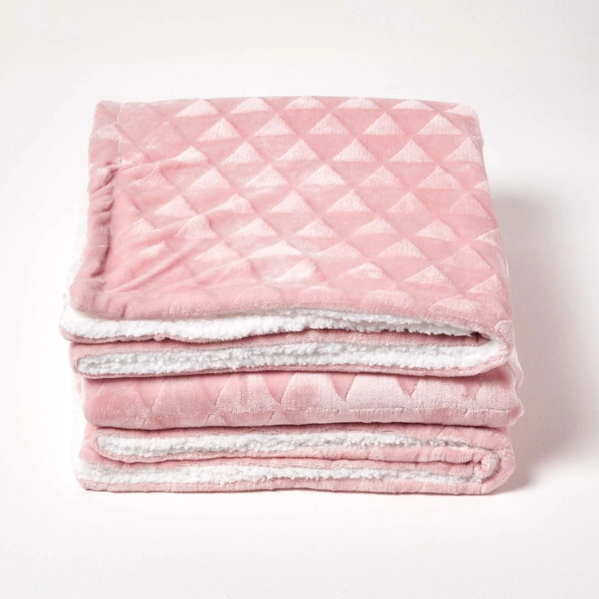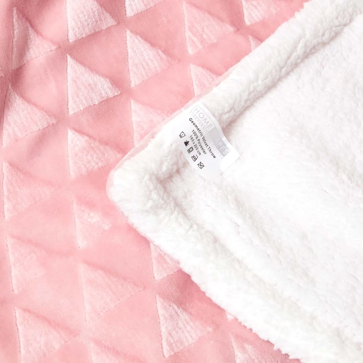 Thick and soft blush pink throw for beds and sofas, this fluffy blanket is cosy and warm and is perfect for cooler months. Featuring an on-trend triangular pattern, this geometric throw is woven from a super soft velvet and has a cream Sherpa fleece reverse.