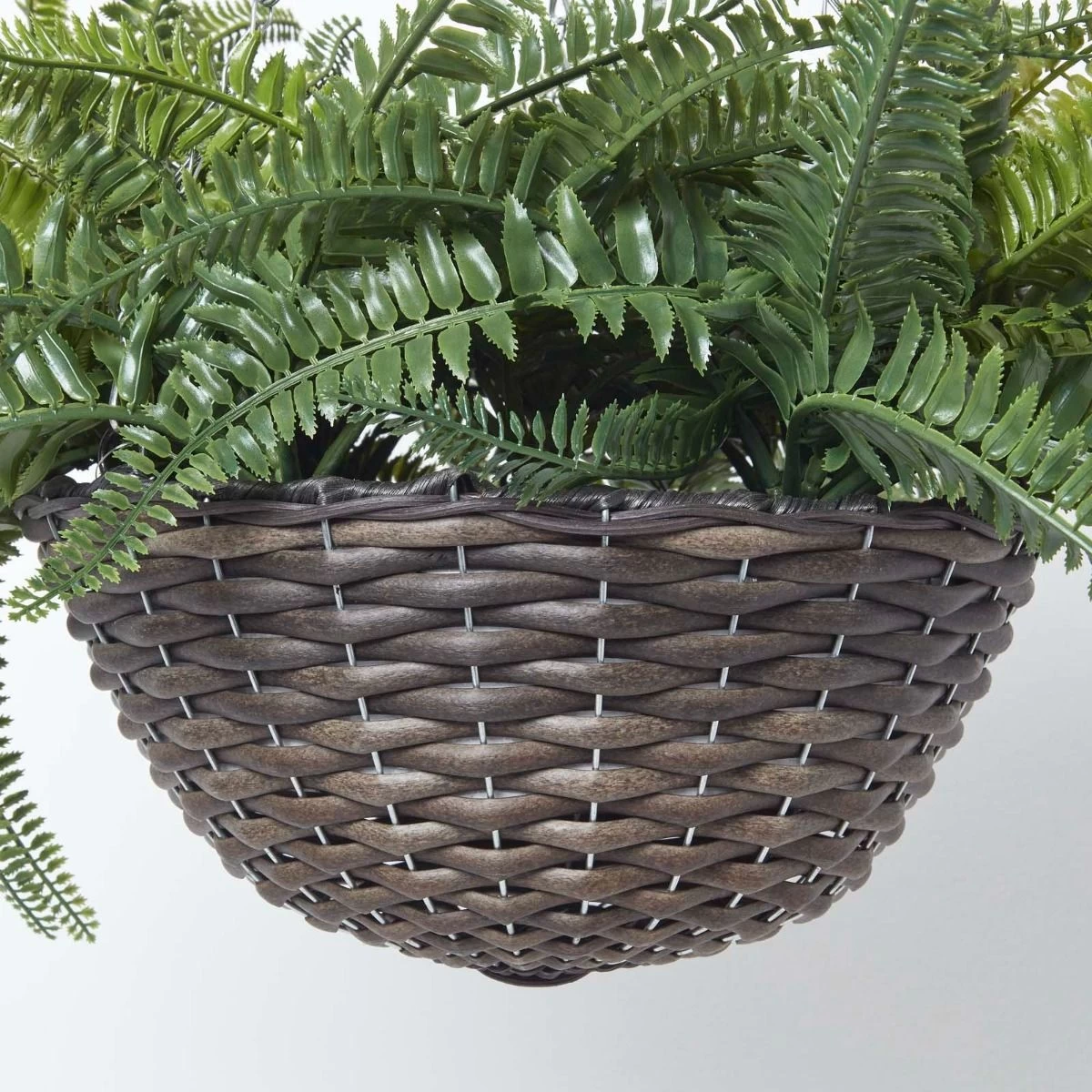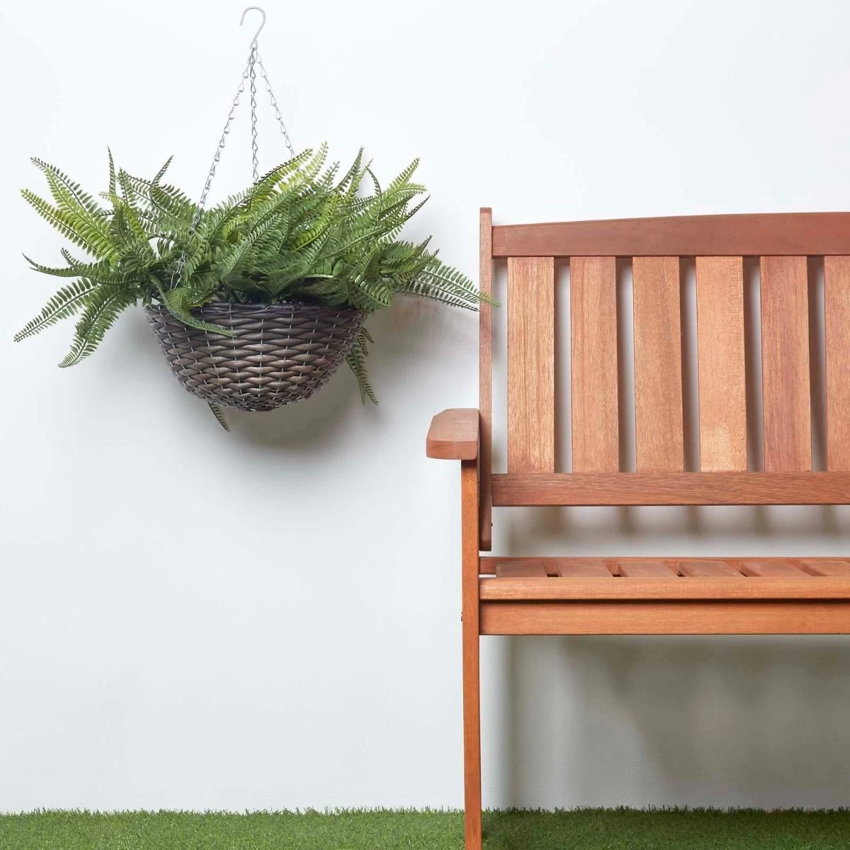 Artificial fern from Homescapes in a decorative rattan style hanging basket with a silver metal hanger bursting with vibrant green Boston Fern leaves, sure to catch guest’s attention.