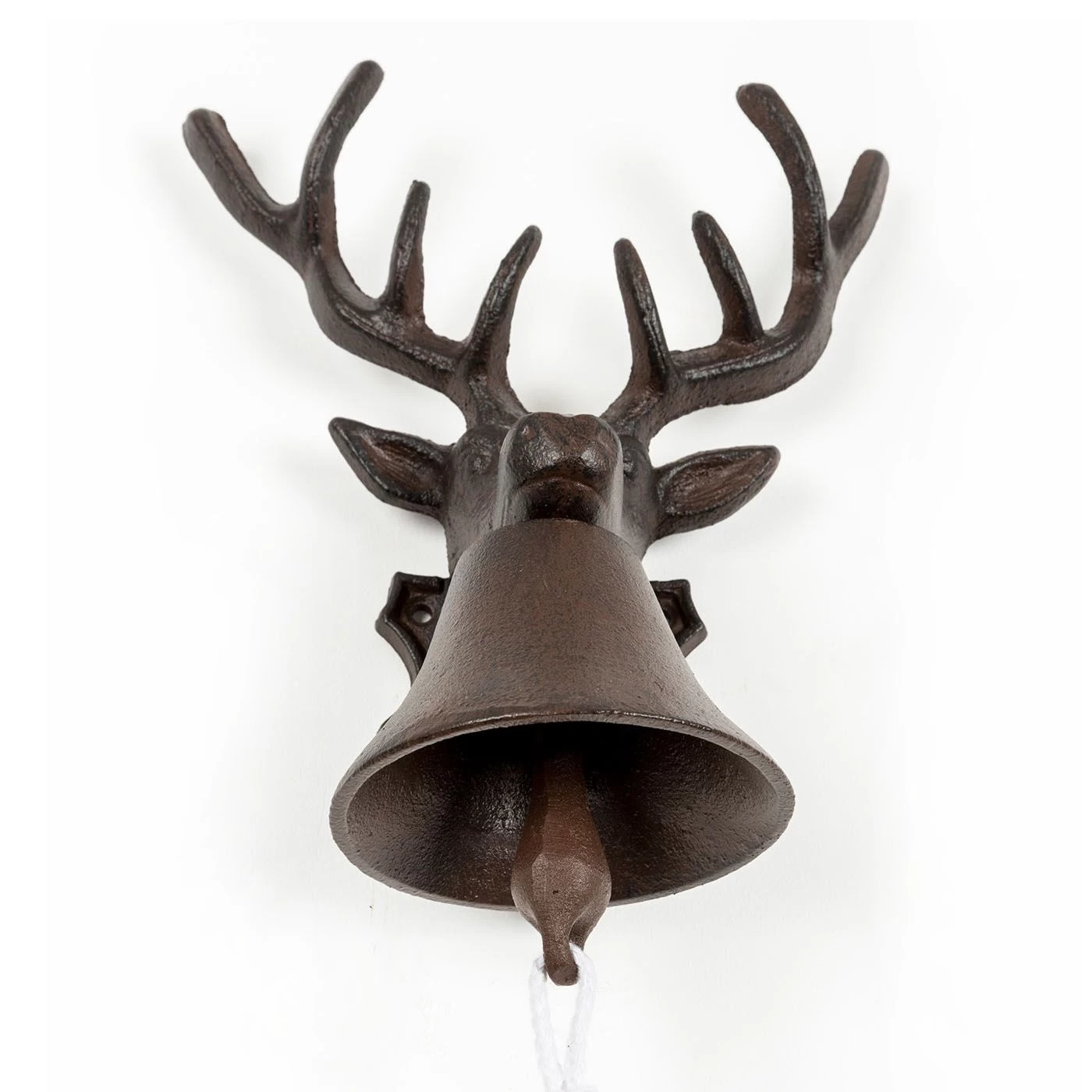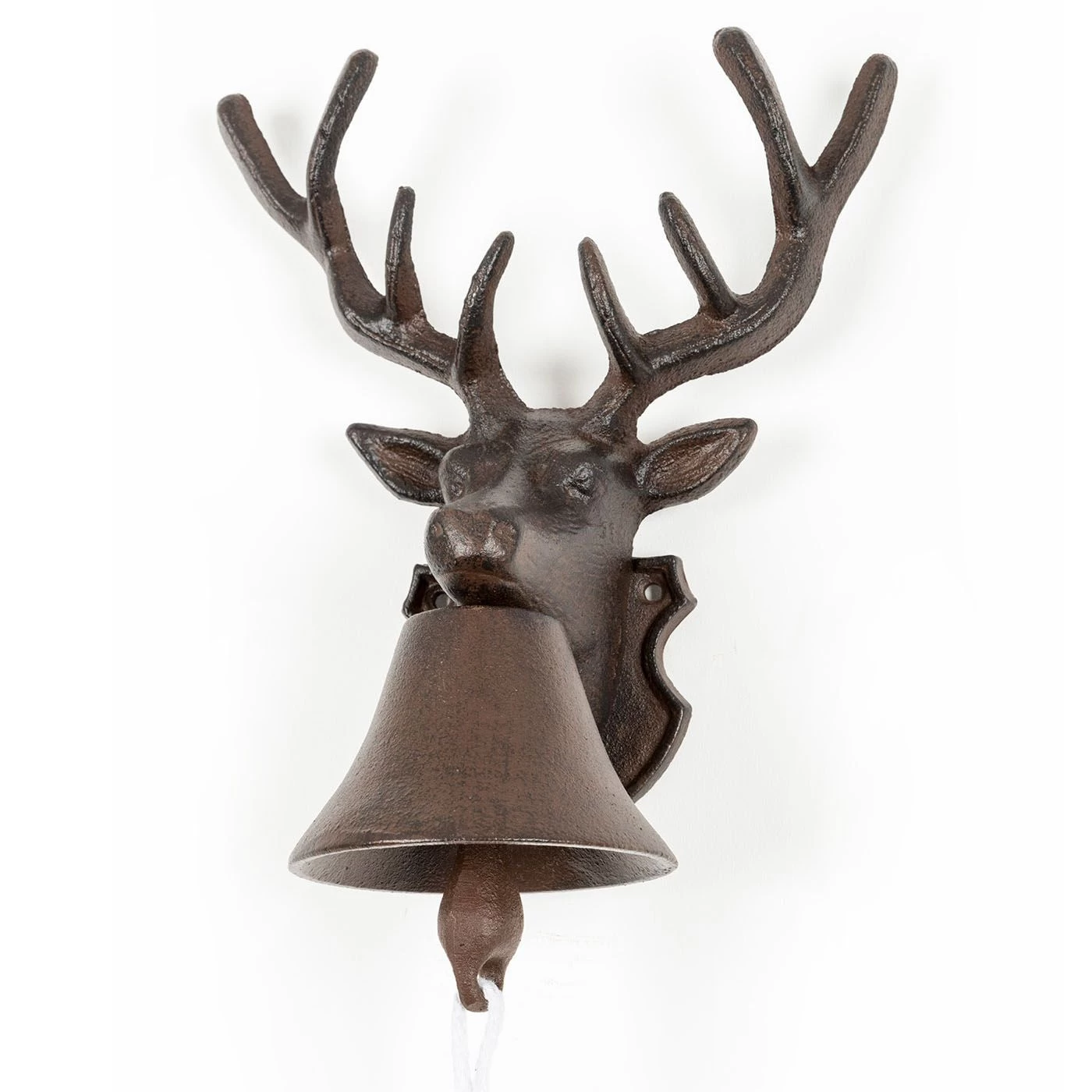 Cast iron doorbell from Homescapes with a deer design. This doorbell will add some country farmhouse style to your home, and it can be easily mounted to your wall. It has a medium sized bell and a white rope pull for easy use.
