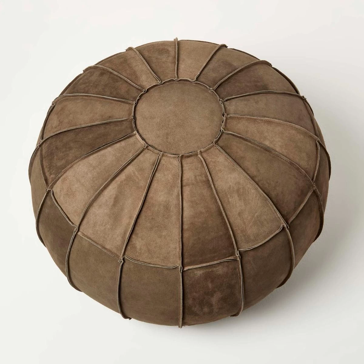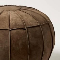 Round brown leather footstool with suede ribbed design. An on-trend round brown pouffe measuring 40 cm tall with real leather and suede cover
