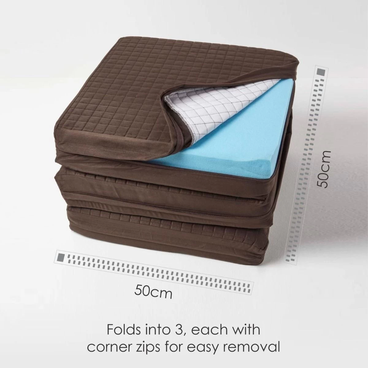 A durable booster cushion designed for everyday use, the firm foam filling is encased within a dark brown faux suede cover that can be easily removed. This soft casing features a square pattern quilting which has been lined with thick and durable polyester for added comfort. Easy to use by all ages, the cover features a compartment for each of the 3 square foam cushions, accessible via a zip running down 2 adjacent sides. The cover can be easily removed and washed and the foam re-inserted, keeping your booster cushion clean and fresh. Easy to transport, each booster cushion has a handy carry handle, the cushion can also be folded away when not in use. Part of Homescapes removable cover orthopaedic booster cushion collection, also available in 2 seater and armchair sizes.
