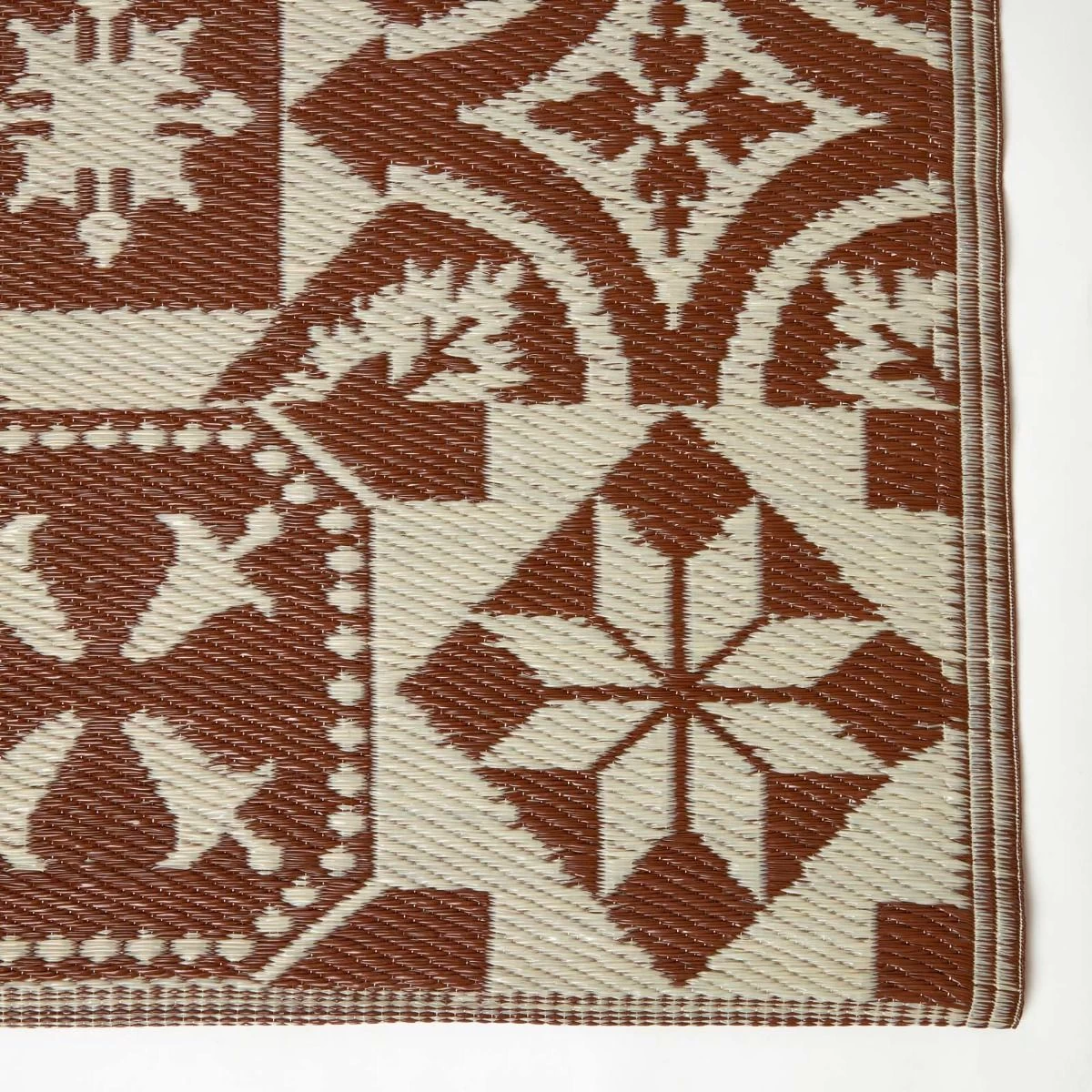 An outdoor rug with a classic tiled pattern. Neutral with hues of beige and brown, this large garden rug measures 182 x 122cm – ideal for indoors and outdoors.