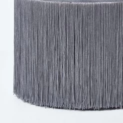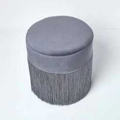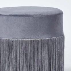 Retro style luxury grey pouffe with fringe detailing from the Buckingham velvet footstool collection. This soft velvet pouffe can be used as a seat or foot rest.