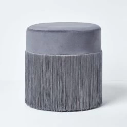 Retro style luxury grey pouffe with fringe detailing from the Buckingham velvet footstool collection. This soft velvet pouffe can be used as a seat or foot rest.