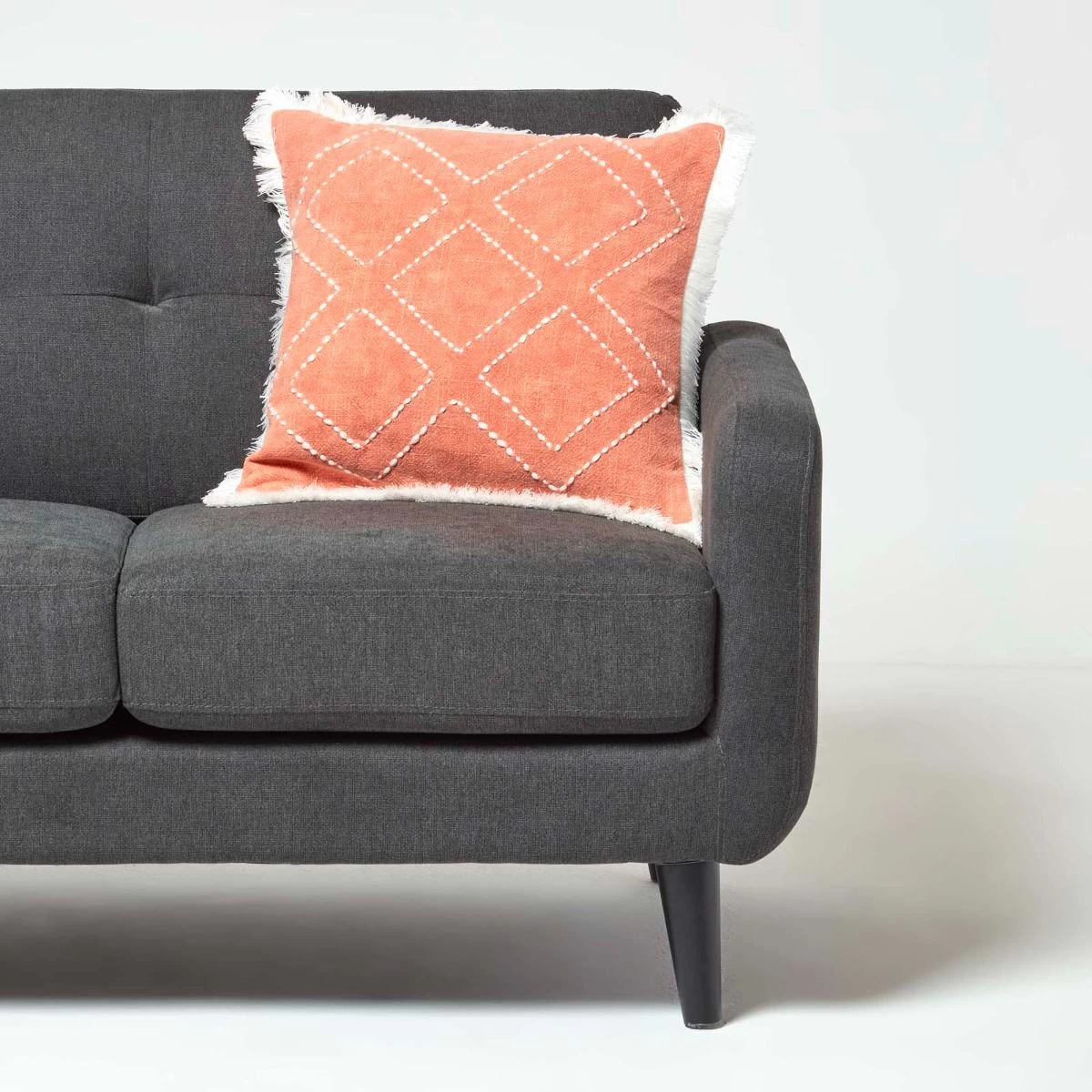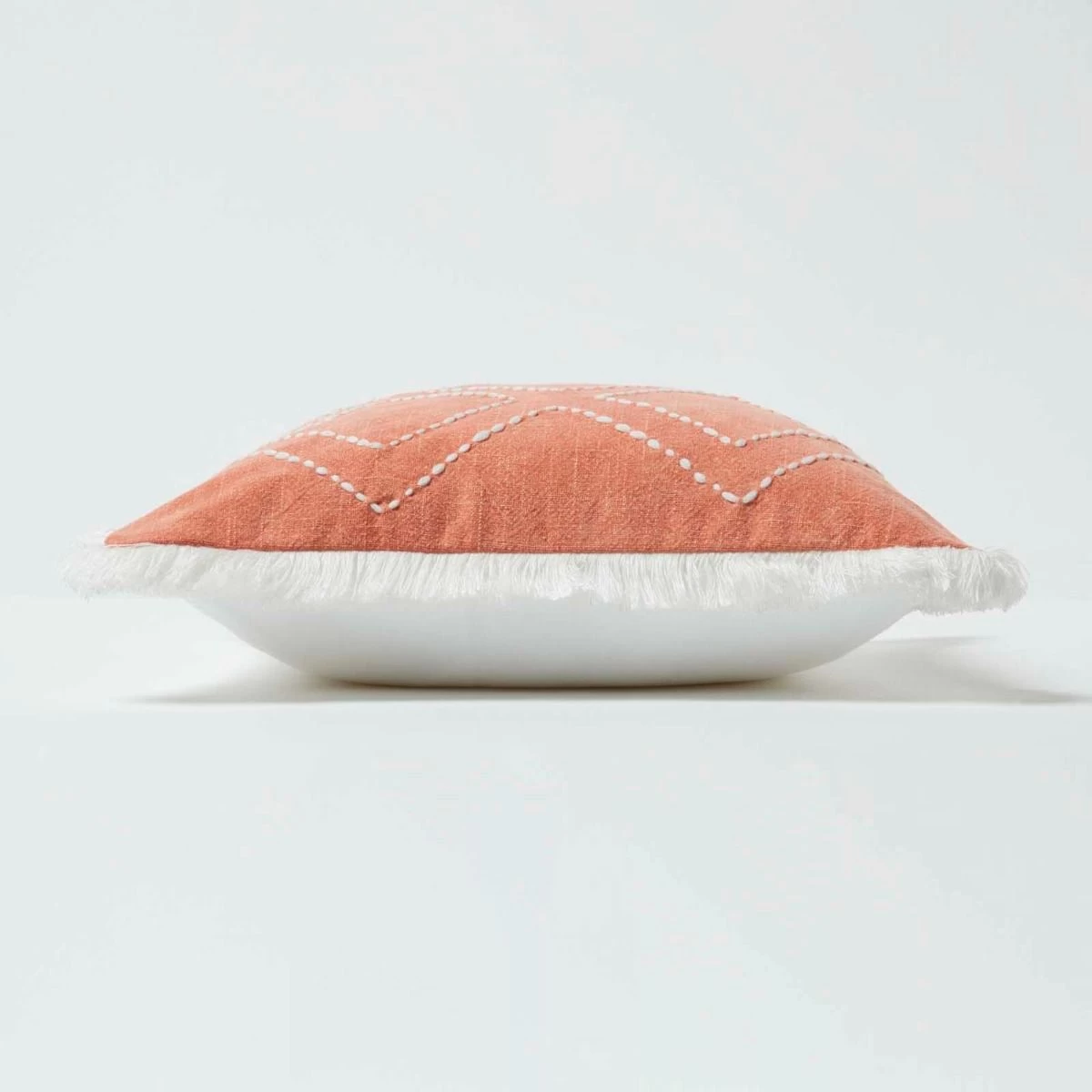 Detailed with white thread and a fringed frame, this embroidered cushion in earthy orange can complement a range of interior styles. Mix and match textures and pair with our luxury cotton cushion covers in a range of earthy tones for a complimentary look.