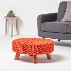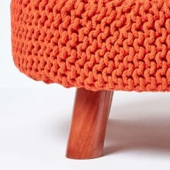 Colourful burnt orange 100% cotton chunky knitted footstool, measuring approximately 30 cm tall and 62 cm wide. Features three wooden legs.