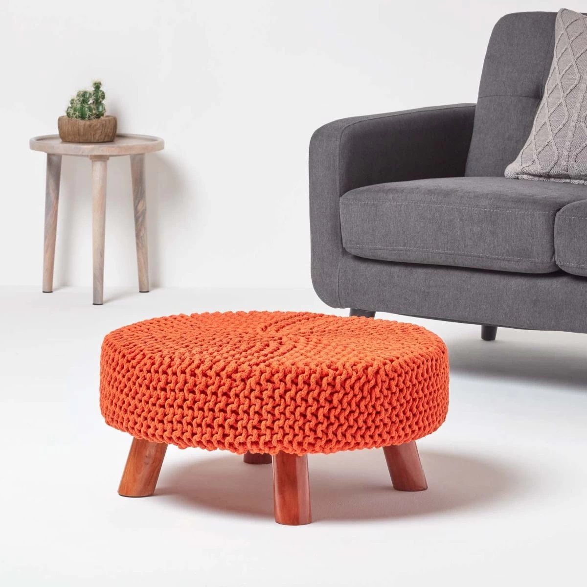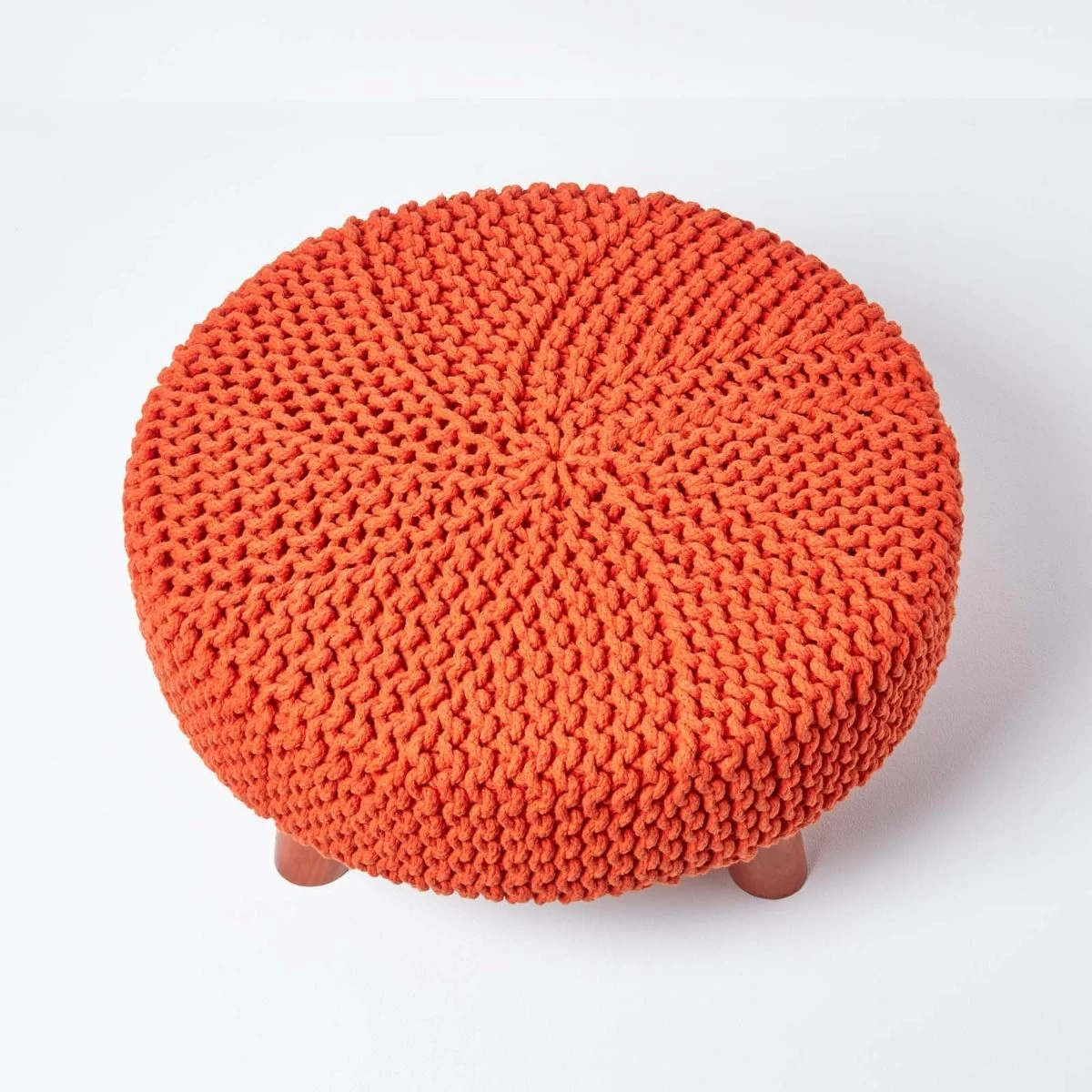 A large circular knitted footstool from Homescapes in a vibrant orange shade to add a burst of colour to your interiors. Handcrafted by skilled artisans, this multifunctional footstool is durable and solid and can be used as a footrest, occasional seat or even as a small coffee table.