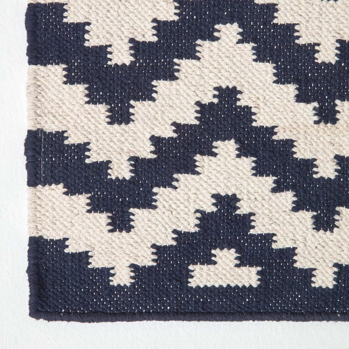 Careful time and patience goes into the making of all of our kilim cotton rugs. Made in India by hand, these rugs are created on a traditional handloom for an authentic look. For a sleek finish, the ends of this rug are folded to give a striking black edge. This rug is available in four sizes including a hall runner.