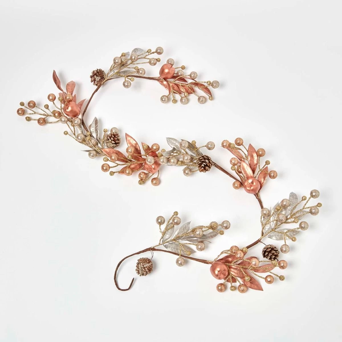 Large decorative champagne and gold Christmas garland decoration, 150 cm long decorative accessory with berries, pinecones and apples, for indoor decoration.