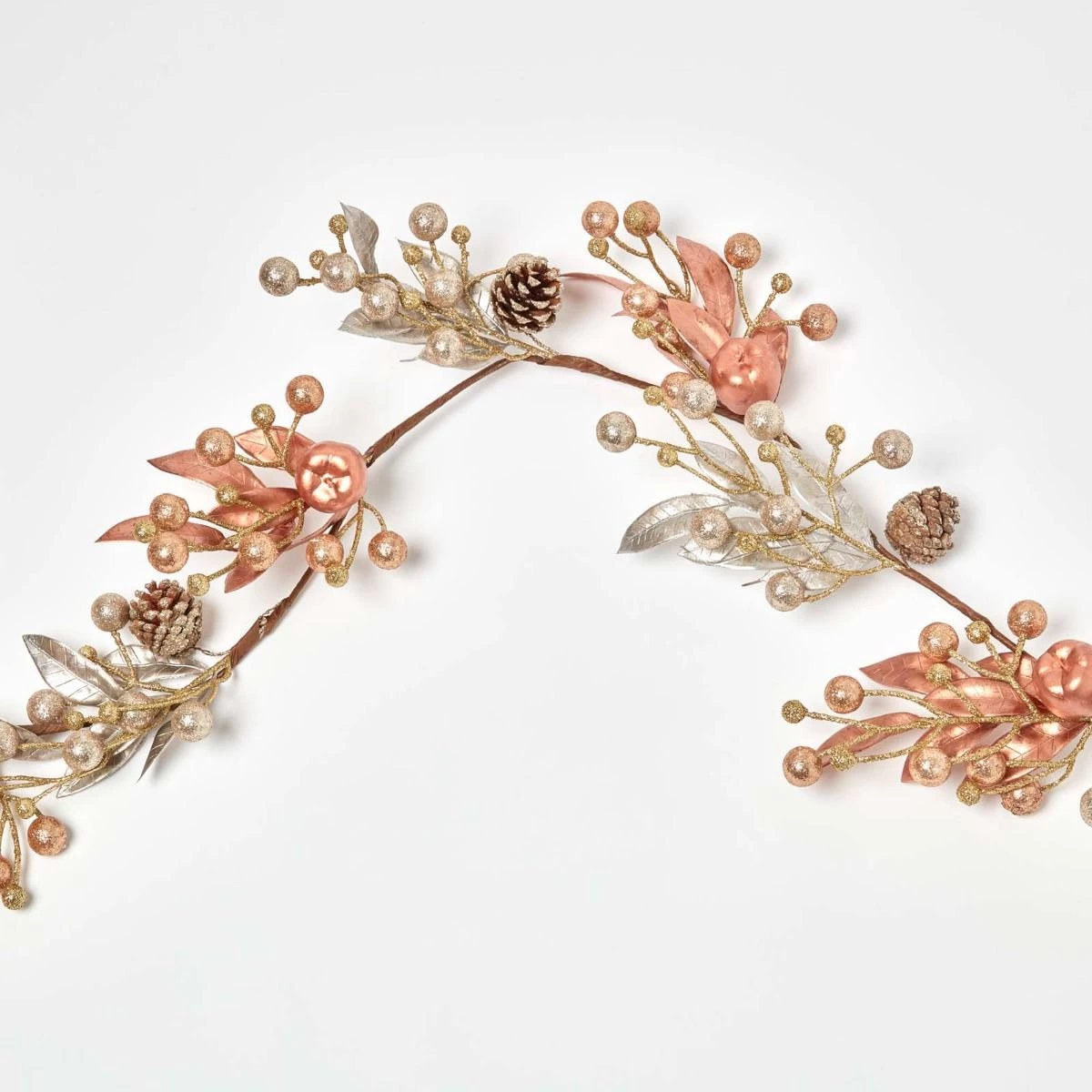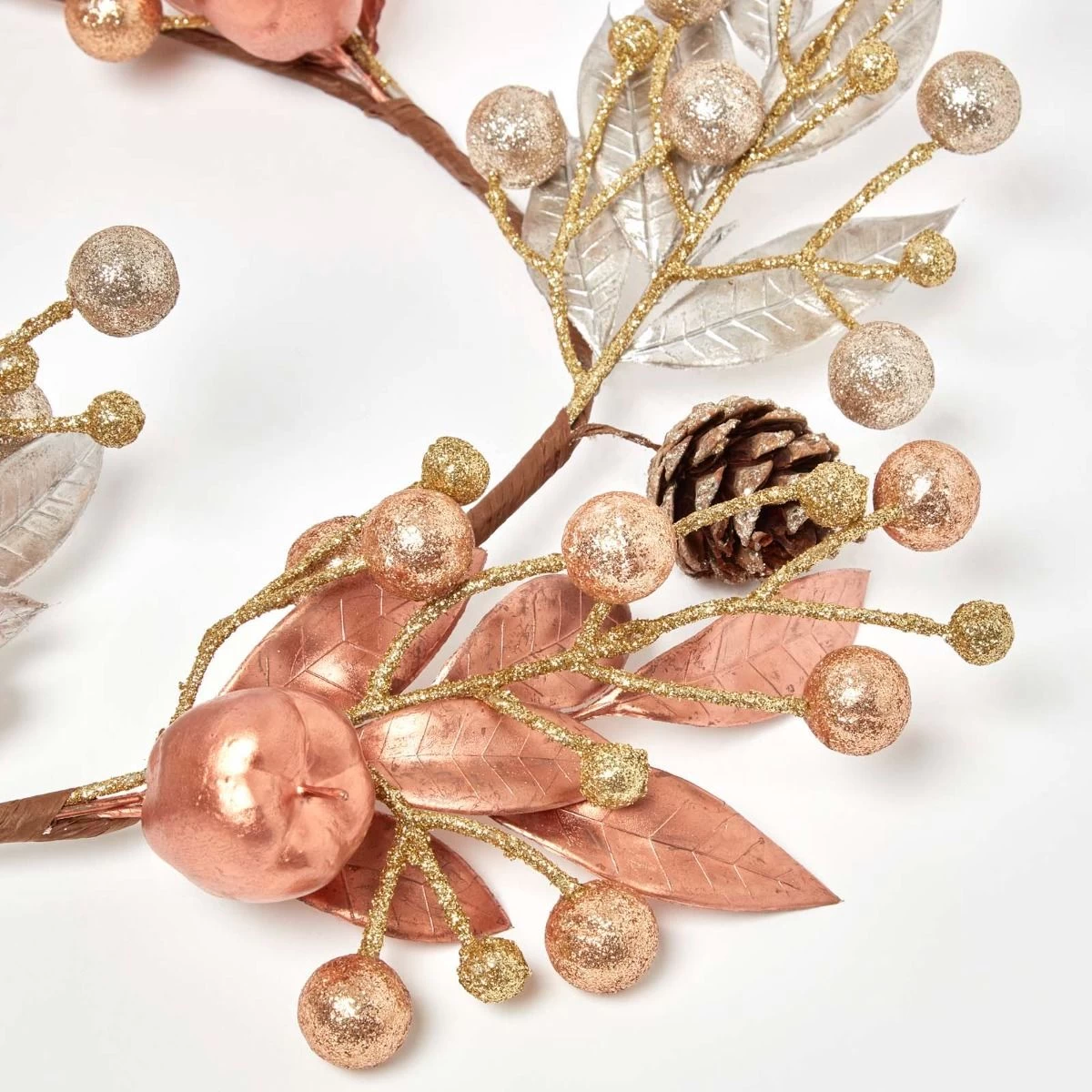 Shimmering champagne and gold Christmas garland decoration. Measuring 150 cm long, this large, modern Christmas accessory is adorned with faux apples, pinecones and berries with a metallic finish. The champagne collection includes co-ordinating swags and Christmas wreaths.