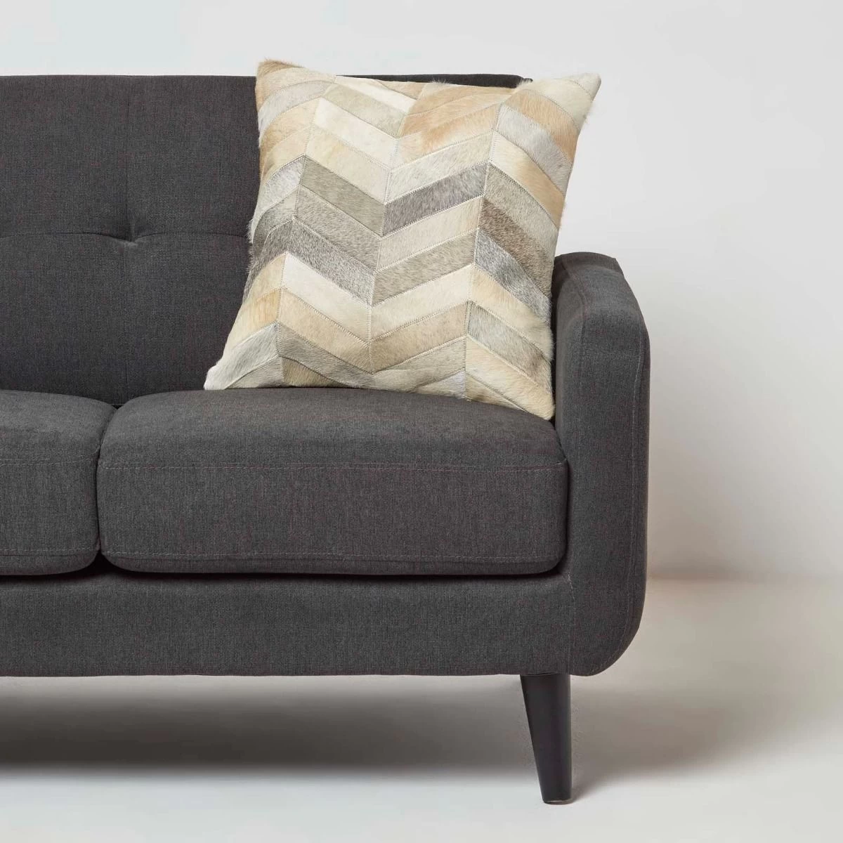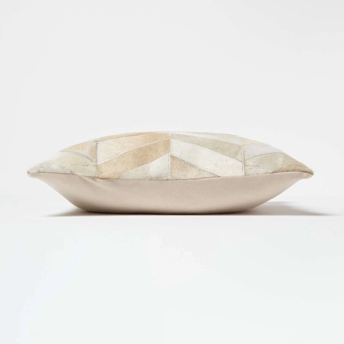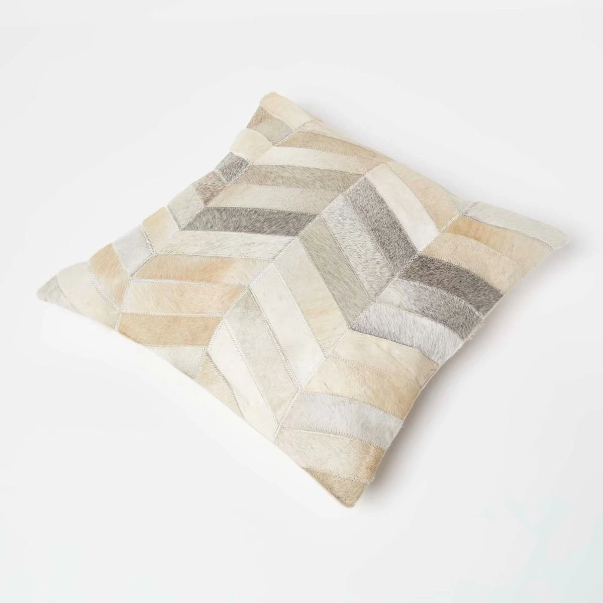 A luxurious sofa cushion with a herringbone style leather front woven from natural hide in shades of soft grey and white. A cosy and textured cushion featuring an on-trend design with a plain cream suede reverse, it’s the ideal addition to any home. Easy to style and the perfect statement piece for your living space, the cushion has been filled with a super microfibre insert and has a zip closure on the reverse.
