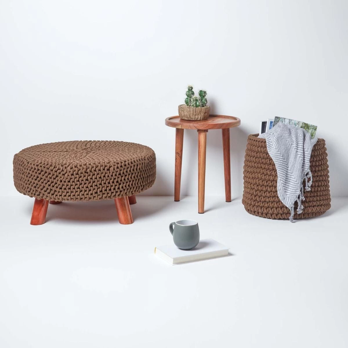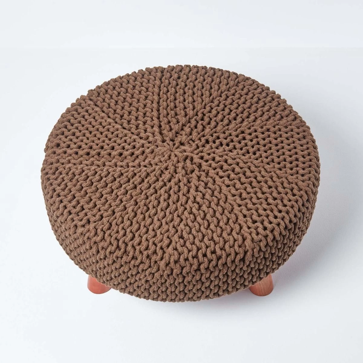 Large circular chocolate brown knitted footstool from Homescapes, measuring 62 cm wide. This footstool has been handcrafted by skilled artisans to create a durable and solid home accessory that you can use as a footrest, occasional seat or small coffee table. In chocolate brown, this footstool will complement neutral interiors.