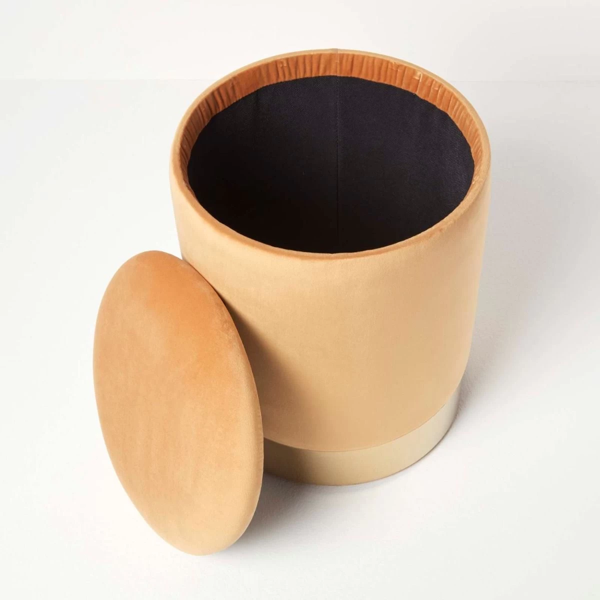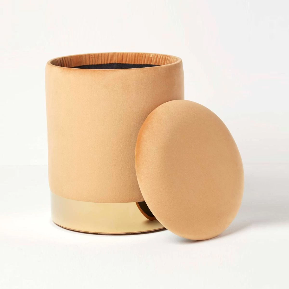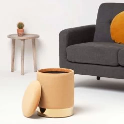 Mustard yellow storage pouffe with fully detachable lid. Measuring 31 x 31 x 38 cm, ideal velvet footstool for occasional seat or footrest.