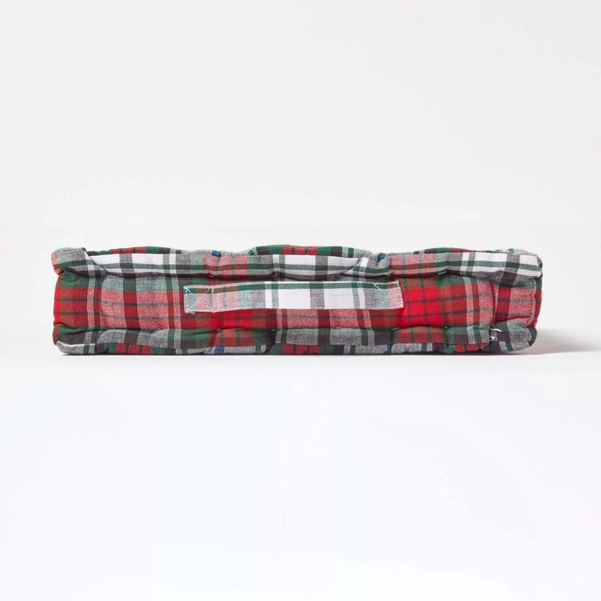 We have a fantastic range of large floor cushions, yarn dyed Floor Cushion Macduff Tartan being one of them. Made up of 100% cotton fabric and filled with high quality resilient fibres this tartan check floor cushion would look lovely in any room. Available in two sizes this floor cushion coordinates well with other soft furnishings such as the scatter cushions, curtains, kitchen linen and fabric in same or similar designs. These floor cushions comes with a carry handle and are easy to carry anywhere indoors as well as outdoors. These can be used as chair pads, seat pads, dining booster cushions, children floor cushions and garden bench cushions. We have a vast collection of floor cushions in plain, thick and thin stripes, beautiful floral and retro prints and classic woven tartan checks.