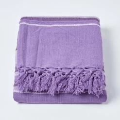 100% Cotton Morocco Striped Mauve Throw from Homescapes range of soft furnishings is designed to provide a quick and extremely affordable makeover of any room. Manufactured on traditional handlooms the colours of Morocco Cotton Striped Throw range have been chosen very carefully which include the current hot trends and also the evergreen classics. This range includes throws in three sizes, 60 x 80 Inches, 90 x 100 Inches and 100 x 140 Inches, coordinating curtains in 54 Inch and 90 Inch drop and prefilled cushions. Homescapes offers this range in solid colours and in stripes made of graduation of colours. Stripes run parallel to tasselled ends, horizontal across the shortest length.