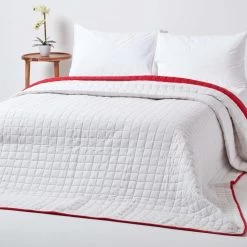 Two colour reversible quilted bedspread from Homescapes, white and red bedspread woven from 100% cotton, heavy weight box stitch cosy throw for sofa or bed.