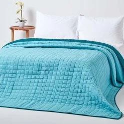 Blue and teal reversible quilted bedspread, this timeless box stitched quilted throw is heavy weighted and ideal for winter months, cosy blanket to bed or sofa.